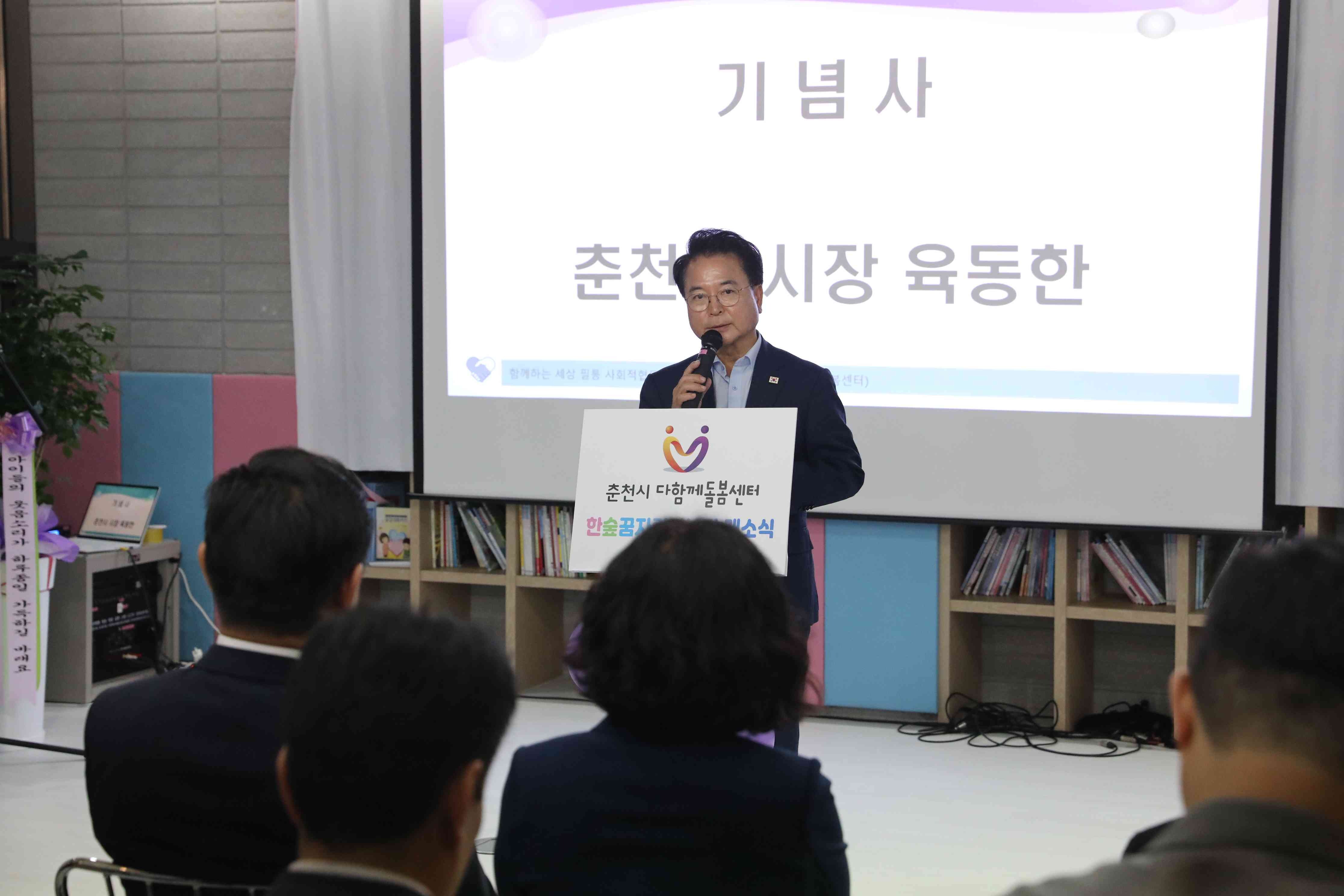 육동한 춘천시장은 기념사에서 “공동체 돌봄을 위한 공간 제공에 흔쾌히 동참해주신 한숲시티 입주민들께 깊이 감사드린다”며 “아이 키우기 좋은 도시 조성을 위해 안전하고 믿을 수 있는 돌봄서비스를 지속적으로 확대해 나가겠다”고 말했다.