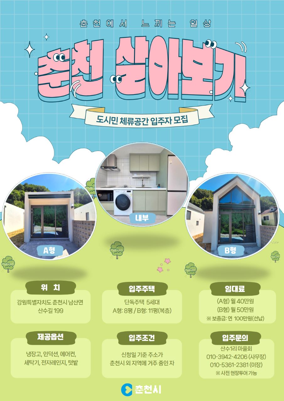 입주 대상은 춘천시 외 지역 거주자로 원룸형(A형)은 월 40만 원, 복층형(B형)은 월 50만 원의 임대료가 적용된다. 보증금은 100만 원이며 냉장고·세탁기·에어컨 등 생활 필수 가전이 모두 구비돼 있다. 운영은 산수1리 마을회가 맡고 위·수탁 기간은 2028년 6월 30일까지다.