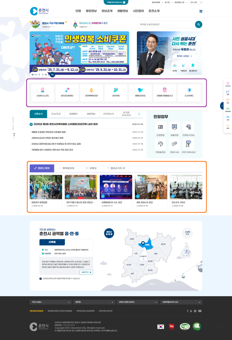 ‘더 쉽고 빠르게’ 춘천시 홈페이지 전면 개선 - 불필요한 팝업 제거‧메뉴 구조 정비로 접근성 강화 - 메인화면 단순화, 시민 선호 정보 중심으로 재구성 - 9월까지 개선 완료, 매월 ‘홈페이지 정비의 날’ 운영 |