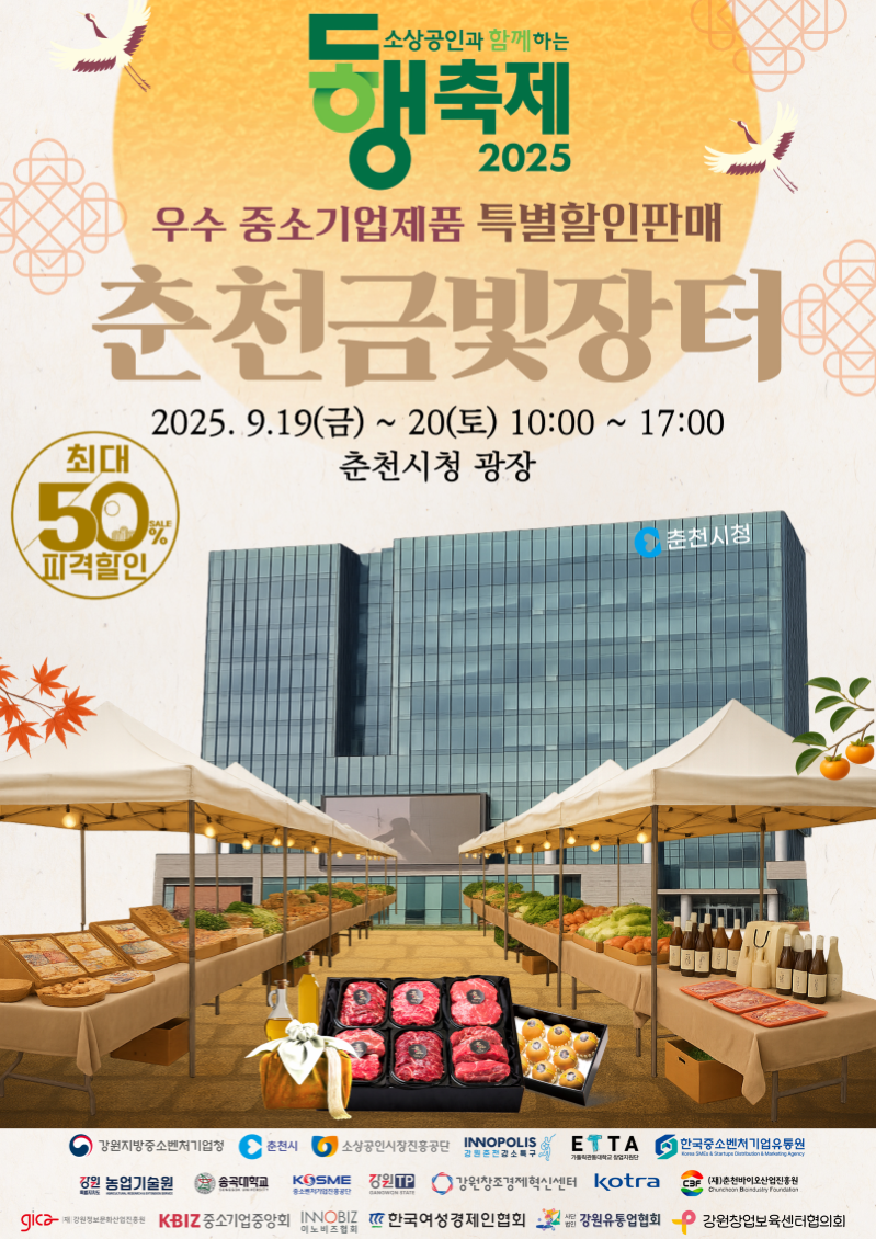 춘천금빛장터는 2025 동행축제와 연계한 지역 상생 소비 축제로, 강원지방중소벤처기업청을 비롯한 18개 유관기관이 힘을 모아 마련됐다. 이번 행사는 추석 명절을 앞두고 시민들에게 합리적인 소비 기회를 제공하고, 도내 중소기업 제품의 판로 확대를 지원하는 데 큰 의미가 있다.