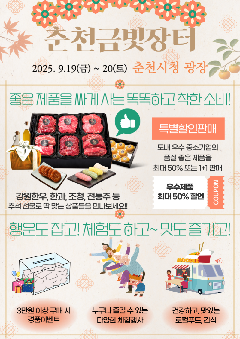 ‘2025 춘천금빛장터’가 오는 9월 19일(금)부터 20일(토)까지 이틀간 춘천시청 광장에서 열린다.