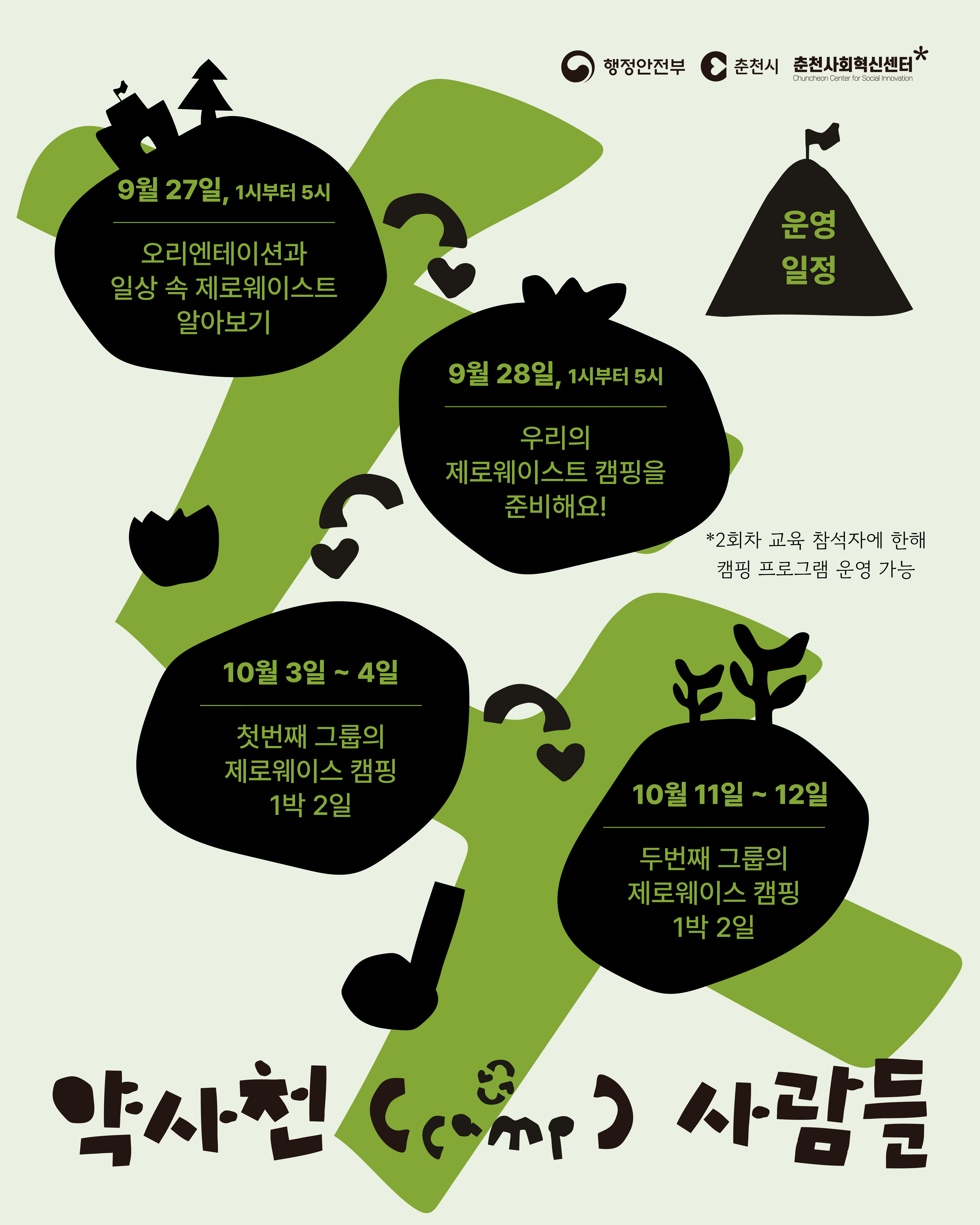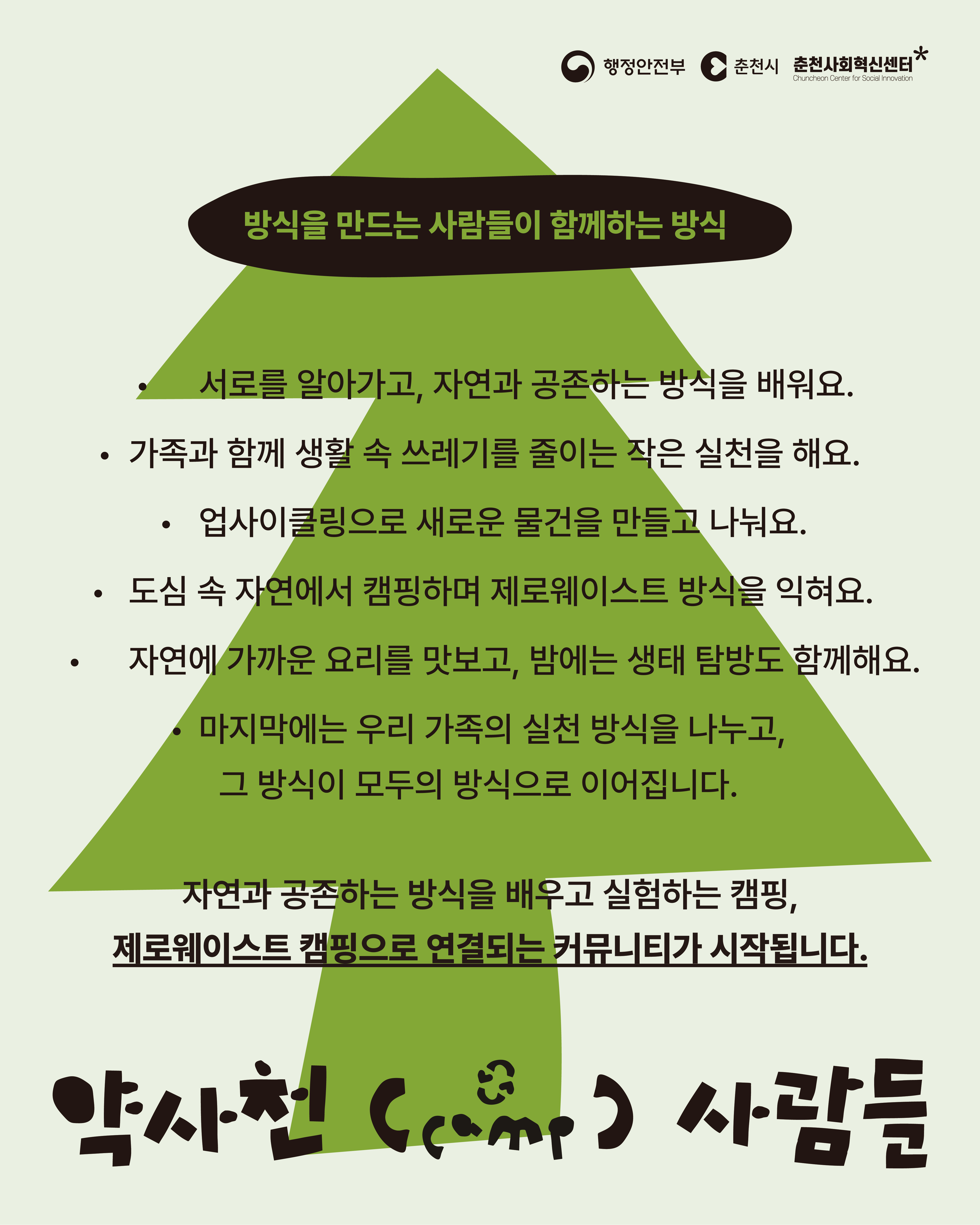춘천시청이(가) 창작한 춘천시, 약사천서 ‘제로웨이스트 도심 캠핑’ 운영 저작물은 공공누리 "출처표시+상업적 이용금지+변경금지" 조건에 따라 이용할 수 있습니다.