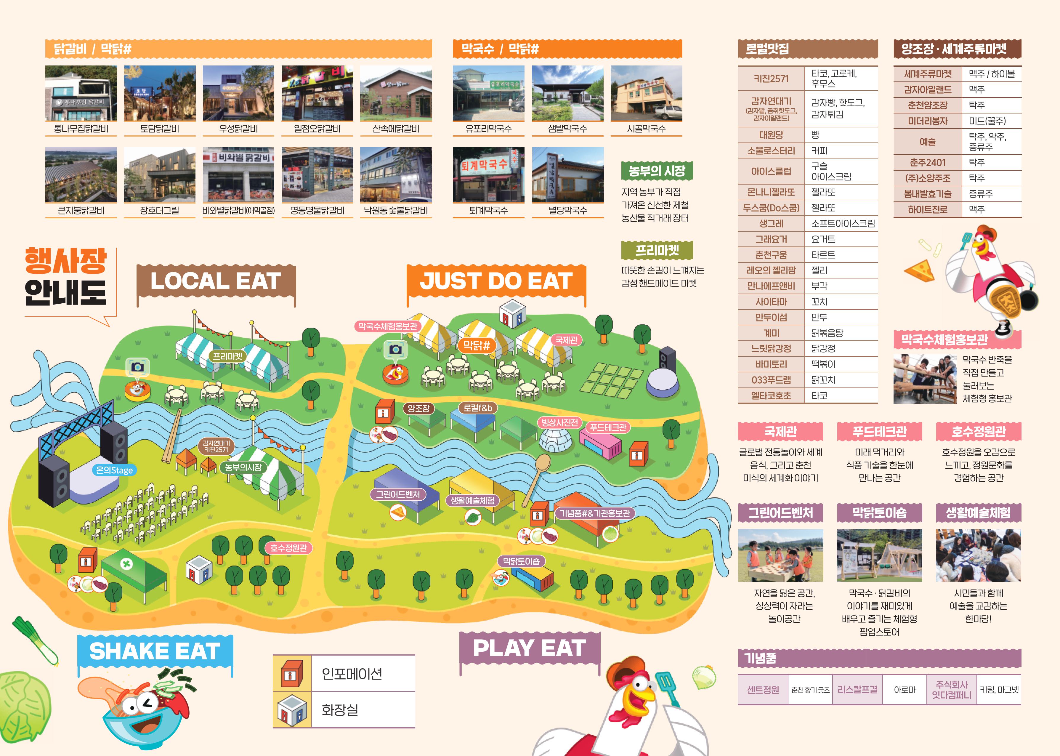 LOCAL EAT에서는 농부의시장과 플리마켓이 열려 로컬의 맛과 감성을 한자리에서 만난다. 감자연대기와 화동2571도 입점해 춘천 대표 브랜드를 한 자리에서 맛본다. JUST DO EAT 구역에선 춘천의 대표 메뉴인 닭갈비와 막국수를 비롯해 로컬푸드와 전통주를 즐길 수 있다. 세계 여러 나라 음식을 체험할 수 있는 ‘국제관’과 로봇이 요리를 선보이는 ‘푸드테크존’도 눈길을 끈다. 무대공연이 펼쳐지는 SHAKE EAT은 축제의 중심을 이루며 PLAY EAT 구역은 가족 단위 관람객을 위한 놀이 체험과 팝업스토어로 꾸며졌다.