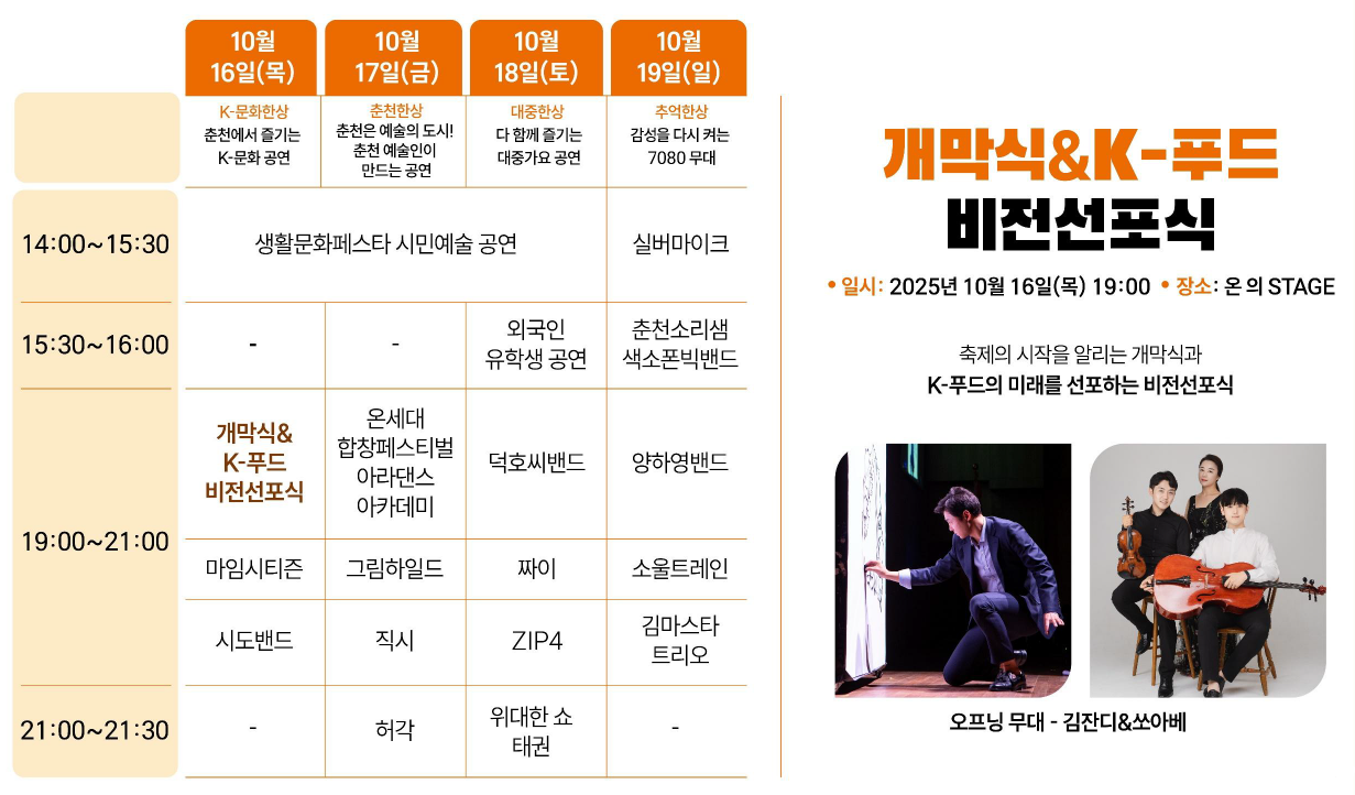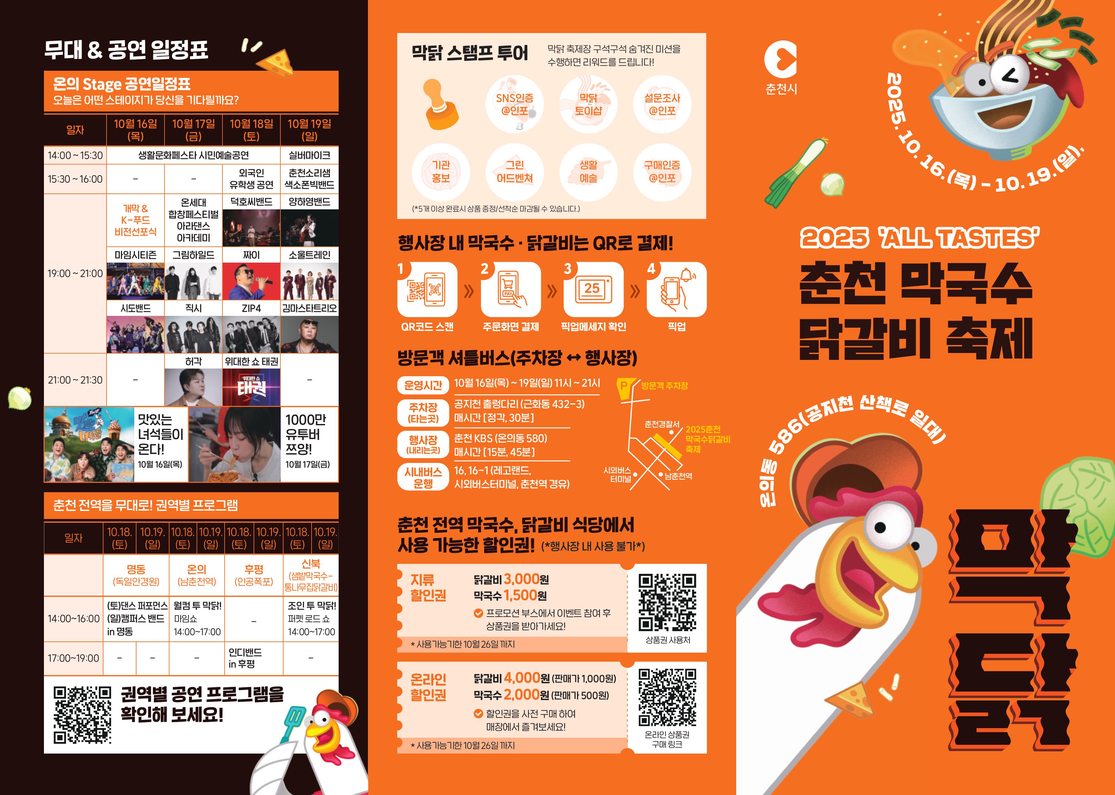 시 관계자는 “막국수와 닭갈비로 상징되는 춘천의 맛을 세계에 알리고 시민과 상인이 함께 웃는 축제를 만들겠다”며 “도심 곳곳이 살아 숨 쉬는 춘천다운 미식 축제로 발전시켜 나가겠다”고 말했다.