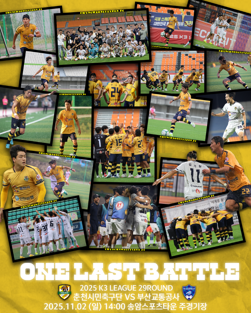춘천시민축구단의 2025 시즌 마지막 홈경기가 오는 11월 2일 오후 2시 송암스포츠타운에서 열린다. 시즌 피날레를 장식할 이번 경기는 팬들과 함께하는 특별한 자리로 마련된다.