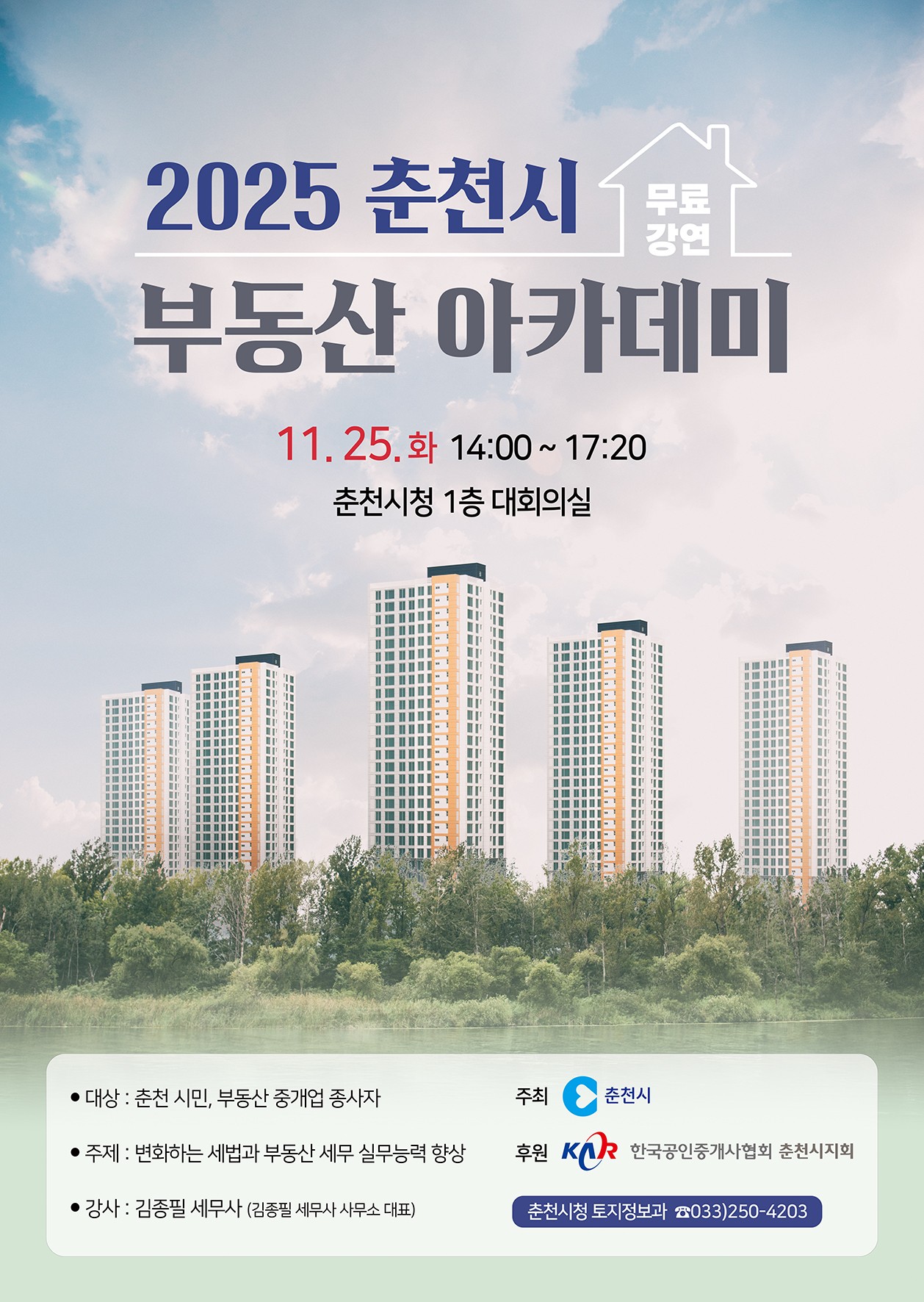 춘천시(시장 육동한)가 초고령화 시대에 접어들며 이슈가 되고 있는 부동산 세무의 핵심을 짚어보는 ‘2025 춘천시 부동산 아카데미’를 연다.