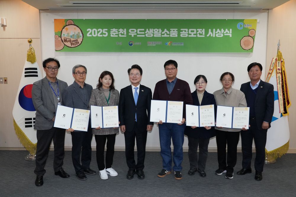 춘천시(시장 육동한)가 28일 시청 접견실에서 ‘2025 춘천우드페스타 우드생활소품 공모전’ 시상식을 열고 우수 작품 5점을 선정해 시상했다.