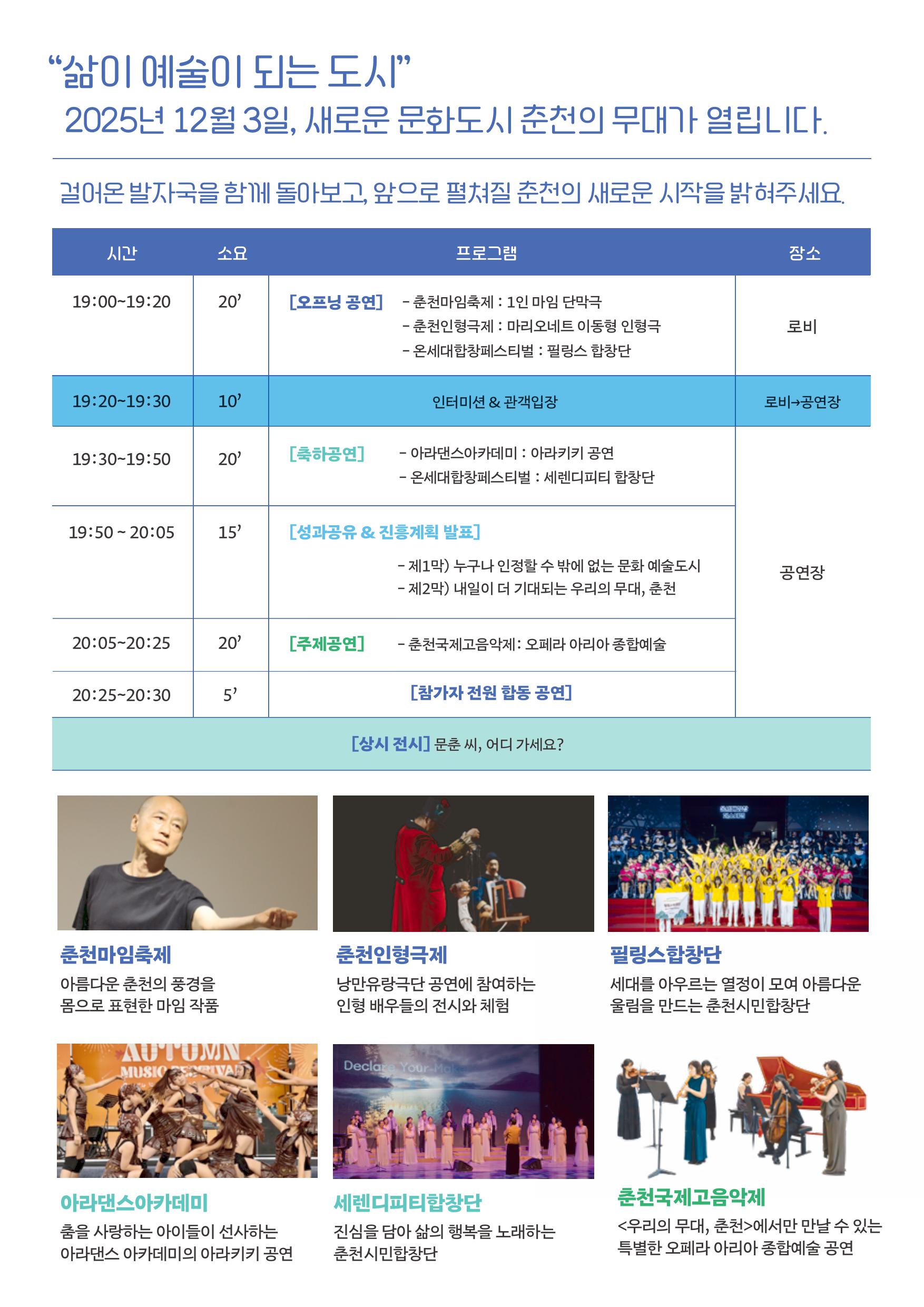 이 행사는 공연과 영상, 전시가 어우러진 축제형 구성으로 하나의 공연축제를 즐기듯 춘천 문화예술의 오늘과 내일을 자연스럽게 경험할 수 있도록 기획됐다.