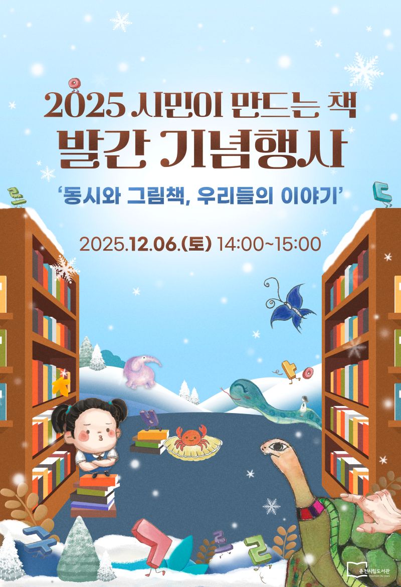 춘천시립도서관은 오는 6일 오후 2시 시립도서관 2층 시청각실에서 2025년 시민이 만드는 책 발간기념식 ‘동시와 그림책, 우리들의 이야기’를 개최한다. 발간기념식은 어쩌다 듀오 축하공연을 시작으로 강좌 소개와 도서 소개 시민 작가와 지도강사의 대화로 진행된다.