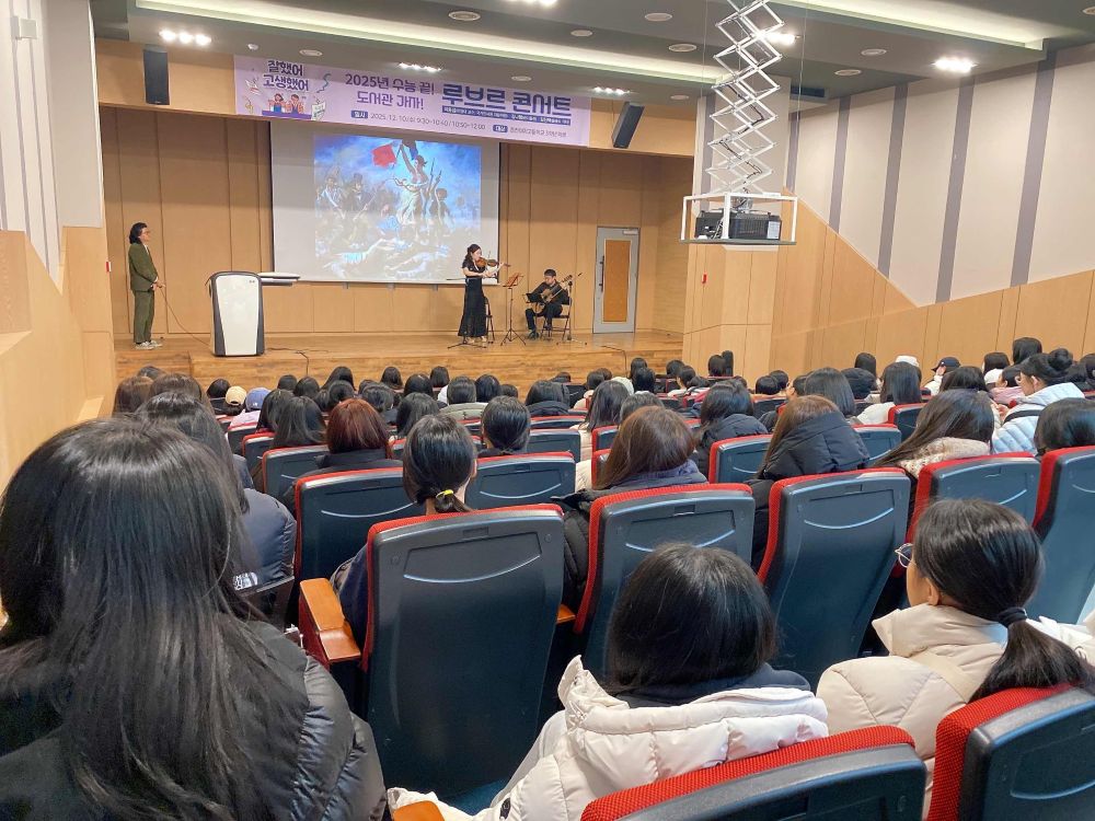 이날 핵심 프로그램으로 열린 ‘루브르 콘서트’는 이동섭 한양대 교수가 루브르 대표작 6점을 해설하고 바이올린과 클래식 기타 연주를 더한 융합형 예술 교육을 이어갔다. △프랑수아 1세 초상화 △밀로의 비너스 △모나리자 등 세계적 명작 이야기가 이어지고 엘가 ‘사랑의 인사’ 라흐마니노프 ‘보칼리제’ 피아졸라 ‘리베르 탱고’ 등이 연주돼 학생들이 예술을 더 가까이, 더 입체적으로 경험했다. 공연 전후로는 학생들이 스스로 고른 책을 읽는 자율독서 시간이 마련됐다.