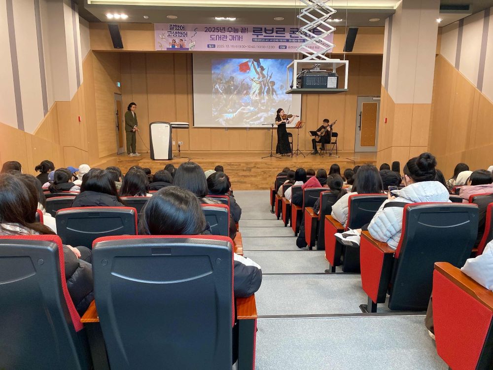 춘천시립도서관, 춘천여고 수험생에게 문화예술 선물 - ‘수능 끝! 도서관 가자!’ 프로그램 춘천여고서 열려 - 루브르 콘서트·자율독서 등 예술·독서 결합 프로그램 - 더 많은 수험생 위해 내년 프로그램 확대 |