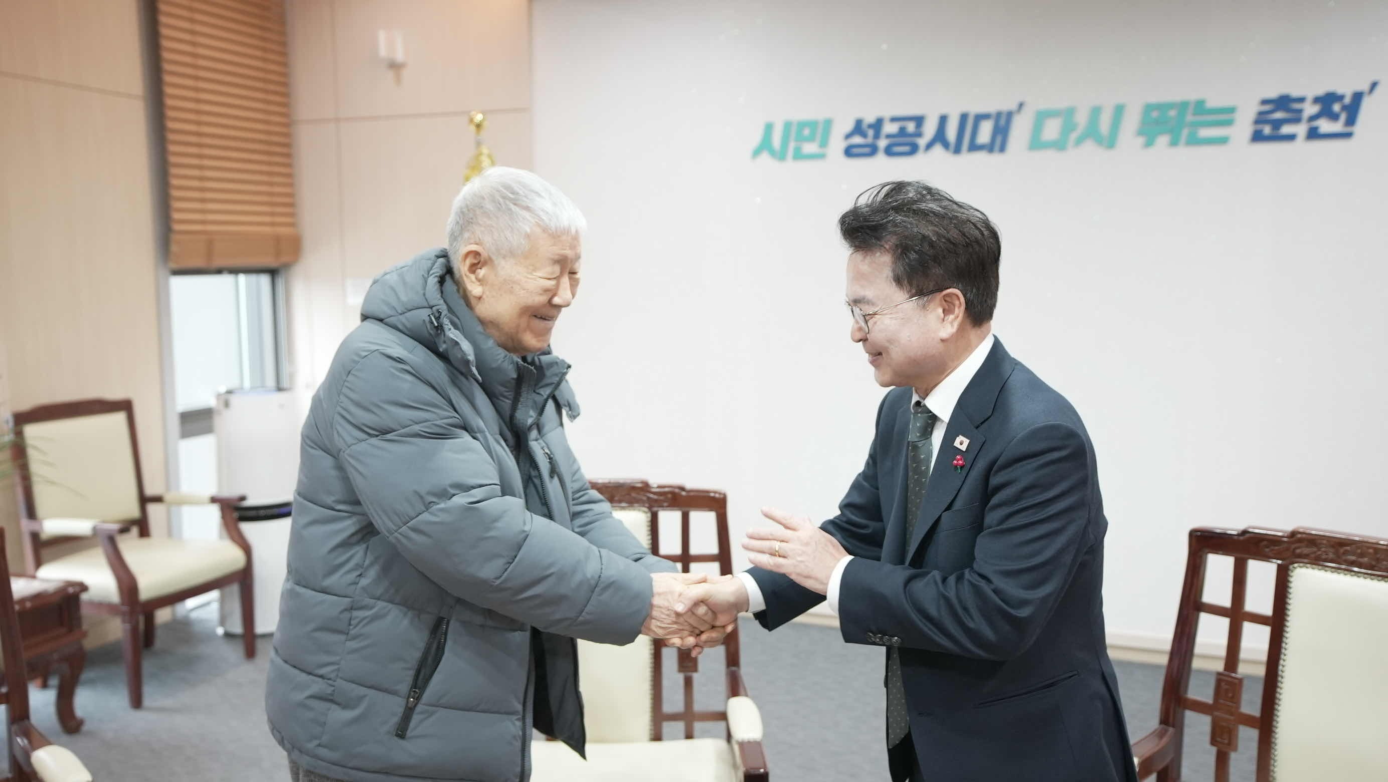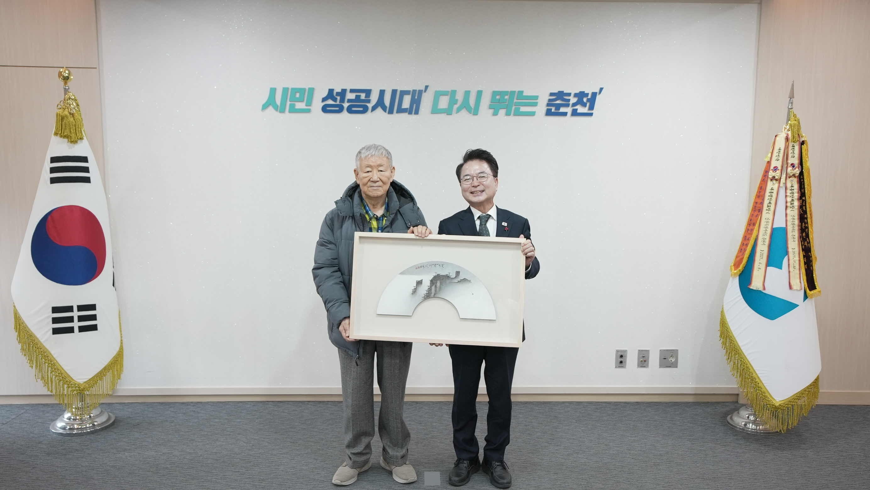 춘천시(시장 육동한)는 23일 시청 접견실에서 운림산방 허씨가문 4대 화가인 임전 허문 작가를 만나 미술 작품 1점을 기증받았다.