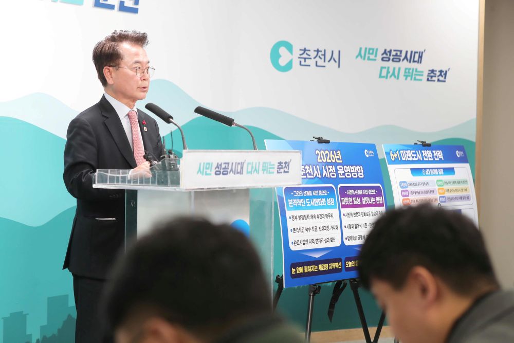육동한 춘천시장은 6일 시청 브리핑룸에서 2026년 시정 운영방향과 핵심 과제를 발표했다. 시는 지난 4년간 추진해 온 시정 전략과 주요 과제를 바탕으로 2026년을 도시 변화가 시민 일상 속에서 체감되는 전환의 해로 만들겠다는 계획이다.