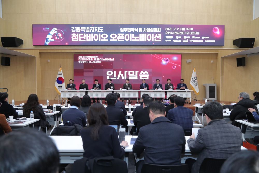 춘천시는 2일 춘천 ICT벤처센터 대회의실에서 강원특별자치도(도지사 김진태), 홍천군(군수 신영재)과 함께 ‘강원 첨단바이오 오픈이노베이션 프로그램 업무협약식과 사업설명회’를 개최했다. 이 자리에는 새로운 앵커기업 2곳과 강원테크노파크·스크립스코리아항체연구원·춘천바이오산업진흥원, 강원대학교 산학협력단 등 유관기관 관계자와 바이오기업 관계자 등 80여 명이 참석했다.