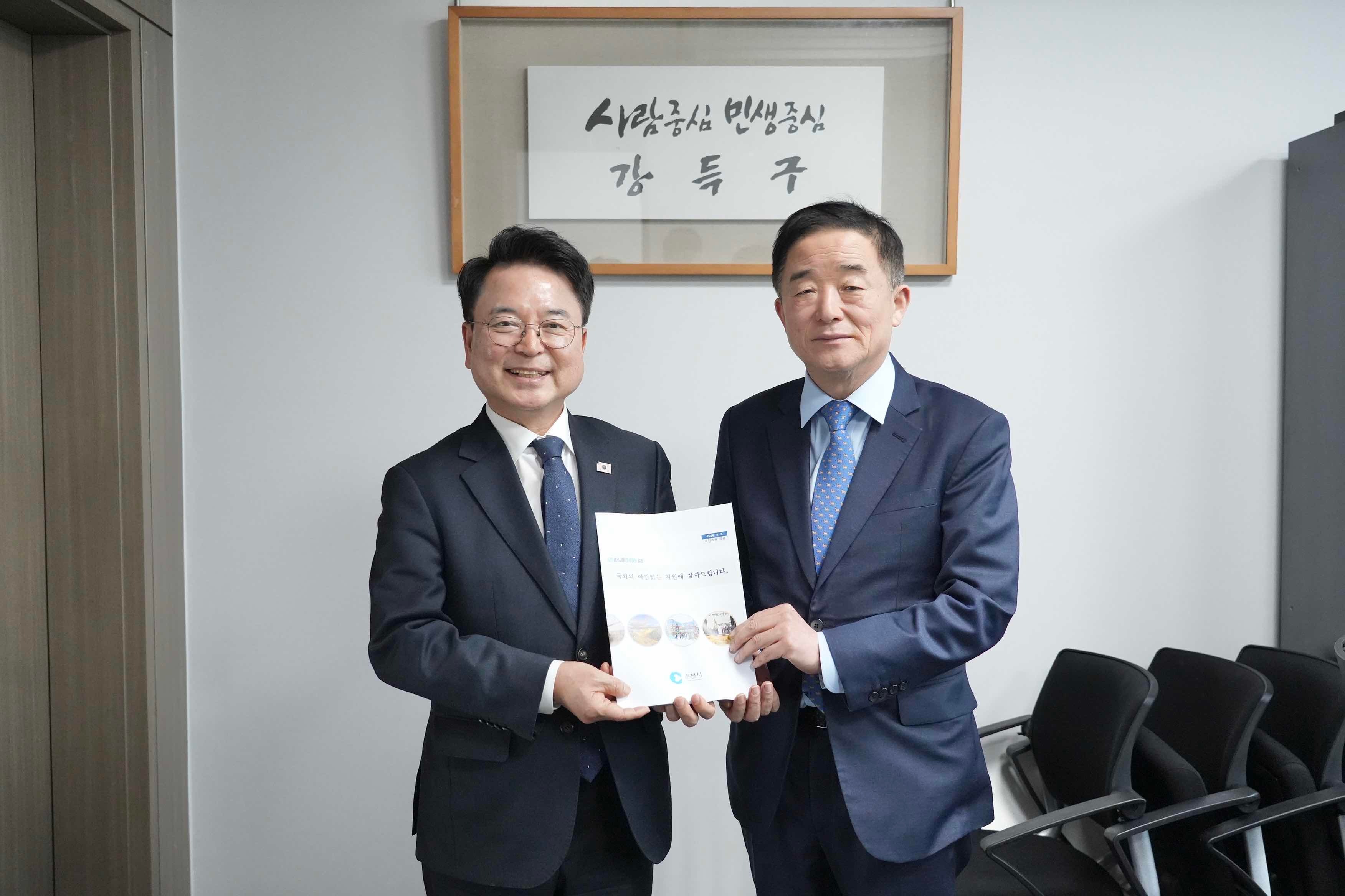 육동한 시장은 “국회의 아낌없는 지원과 배려에 감사드린다. 앞으로도 국회와 정부부처와의 긴밀한 협력을 지속하겠다”고 했다. 허영 의원은 “금년에도 춘천시와 원팀이 돼 그간의 성과를 이어가겠다“고 말했다.
