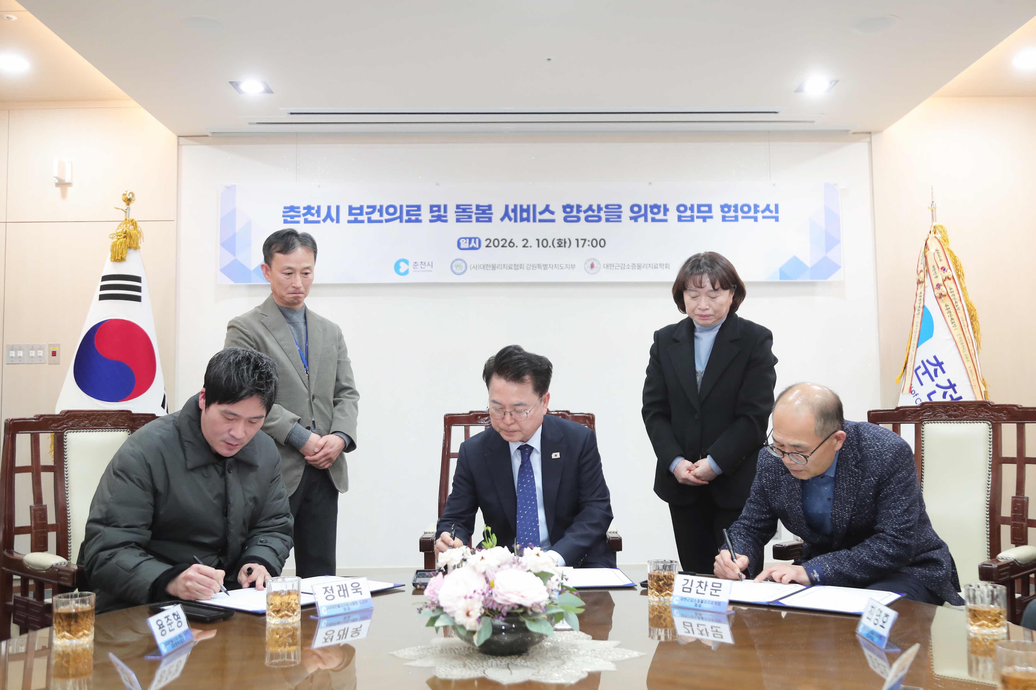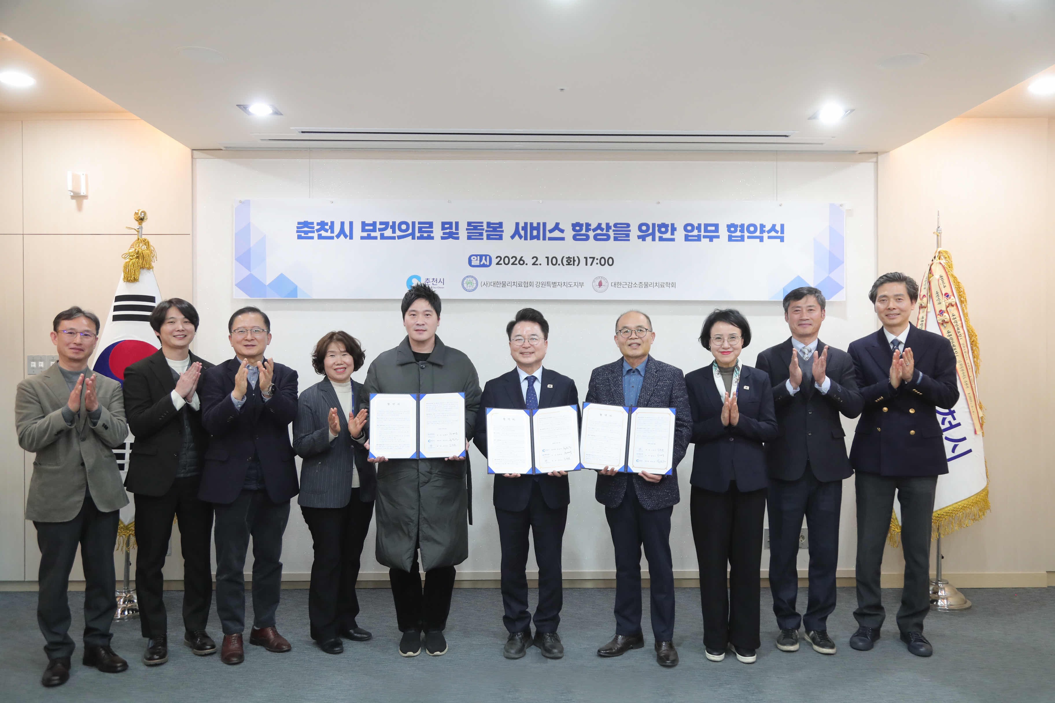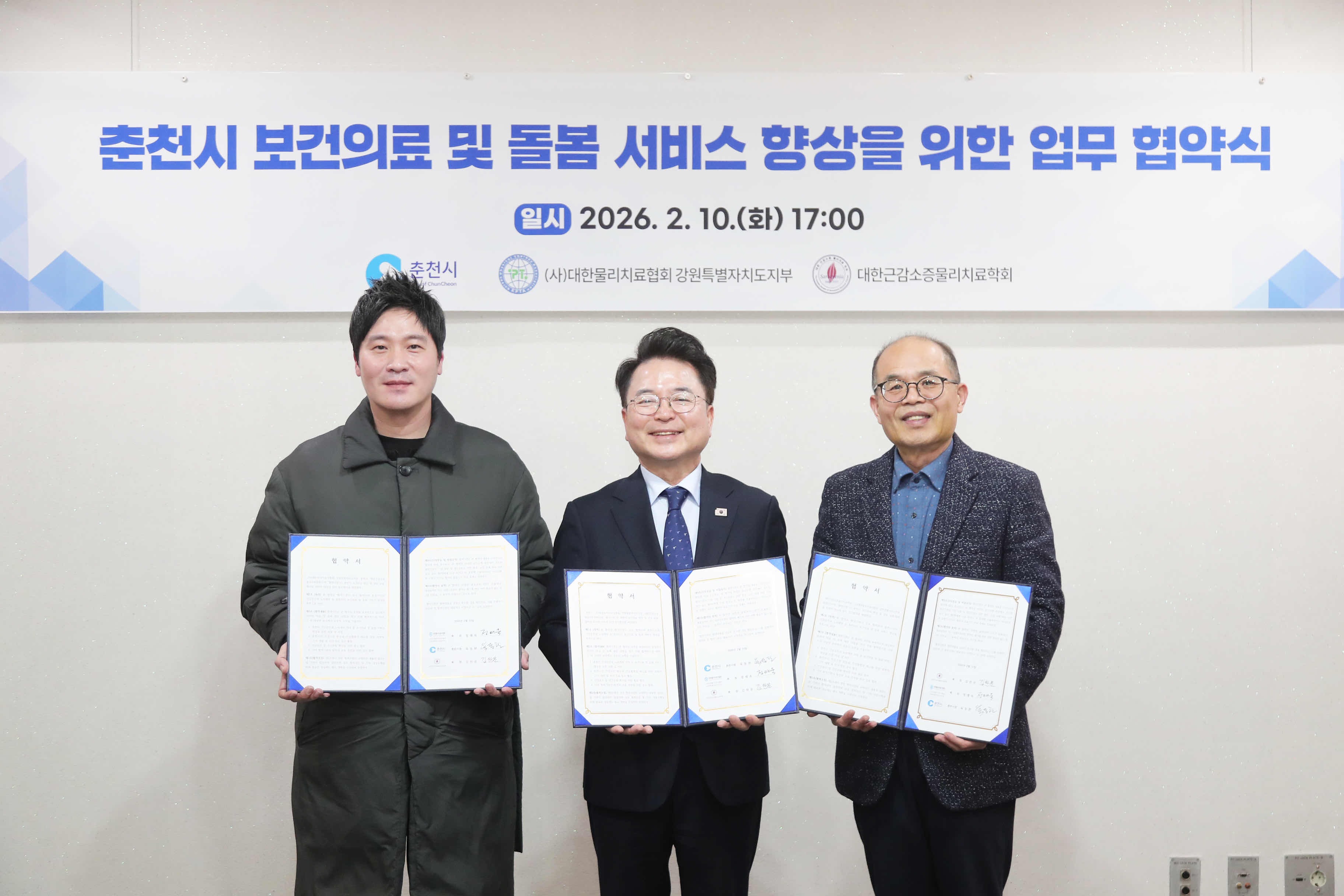 육동한 춘천시장은 지난 10일 시장 접견실에서 (사)대한물리치료사협회 강원특별자치도지부(지부회장 정래욱), 대한근감소증물리치료학회(회장 김찬문)와 업무협약(MOU)을 체결했다.