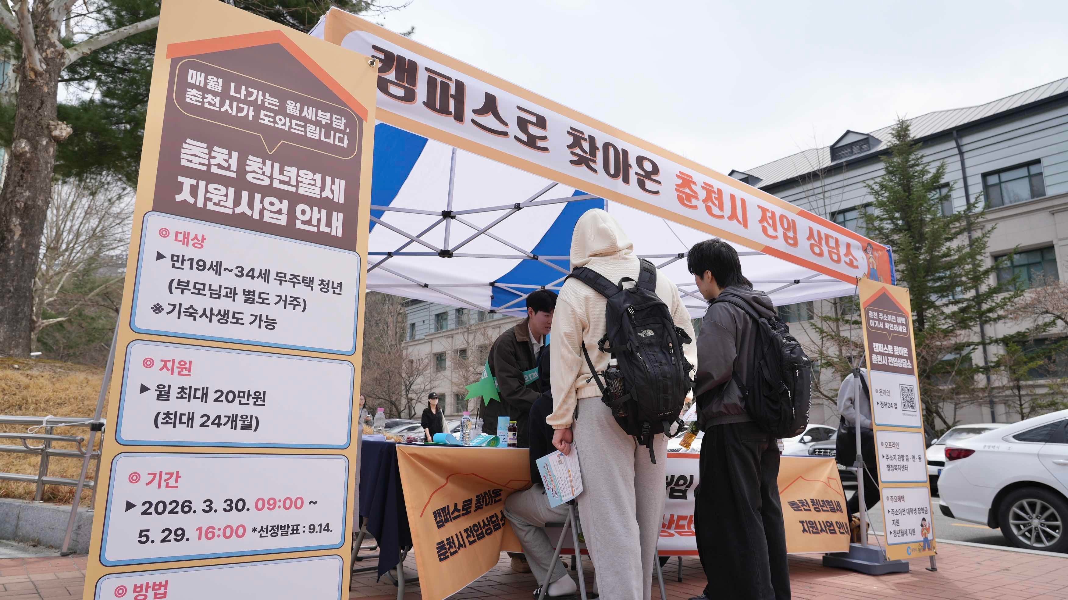 ‘주소 옮기고 혜택 받자’ 춘천시 대학생 주소이전 캠페인 - 강원대·한림대·춘천교대 찾아 ‘전입상담소’ 운영 - 장학금·청년월세까지… 대학생 맞춤 혜택 현장 안내 - 청년 유입 겨냥, 정주 유도형 인구정책 본격화 |