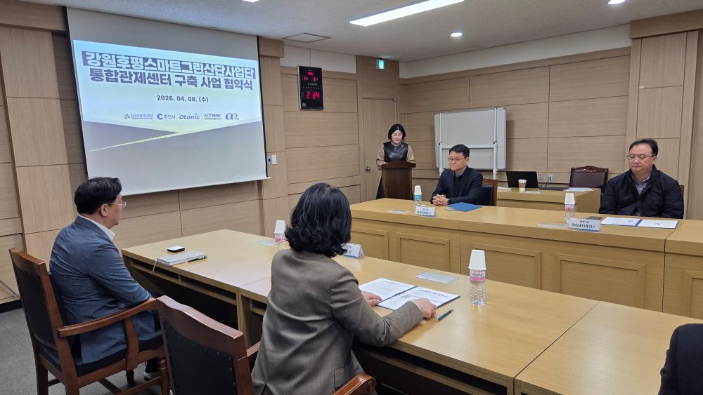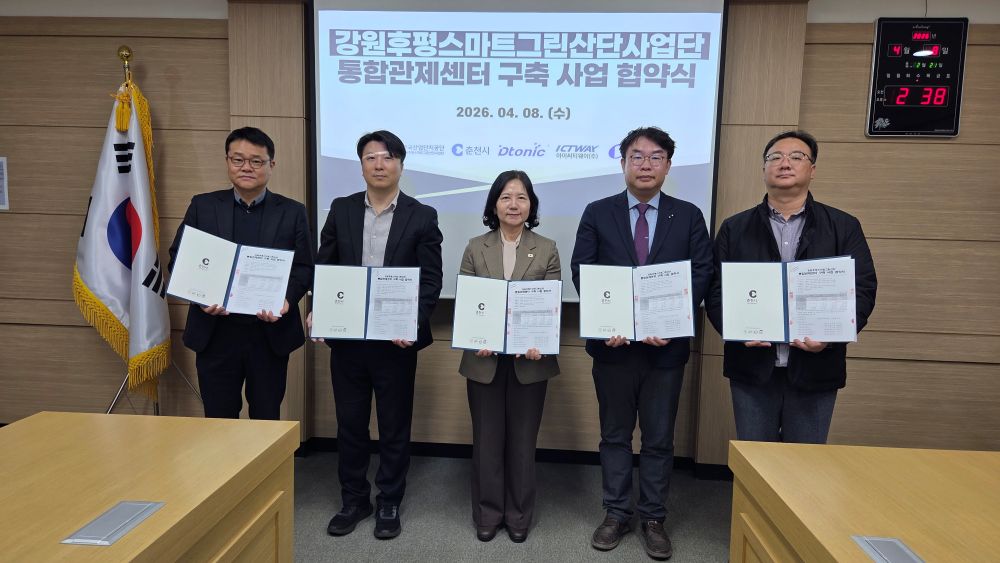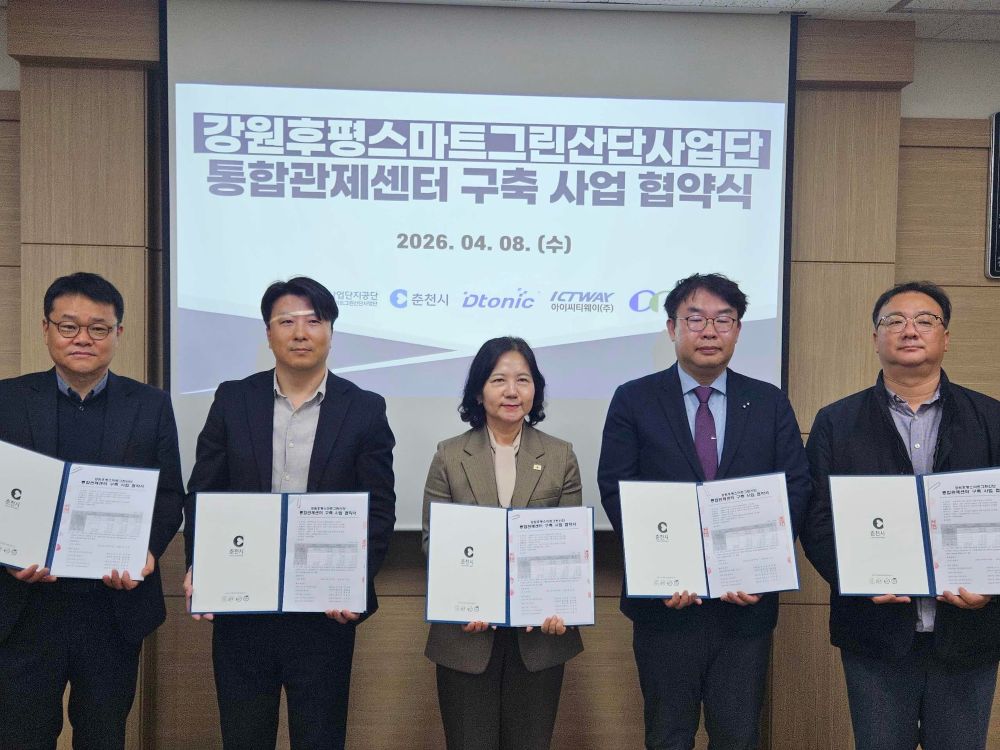 춘천시와 전담기관인 한국산업단지공단 그리고 참여기관인 디토닉㈜, 아이씨티웨이㈜, ㈜동림티엔에스는 8일 한국산업단지공단 춘천지사에서 ‘강원후평스마트그린산단 통합관제센터 구축사업’ 협약을 체결했다.