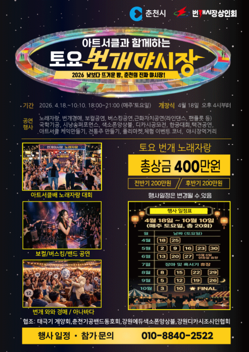 토요일 밤 여는 번개야시장…춘천 야간상권 다시 켠다 - 4월 18일 개장, 10월 10일까지, 현충일과 7월 제외 매주 토요일 - 먹거리·공연·플리마켓 결합…시민 참여형 야시장 확대 - 소양강·아트서클 연계, 체류형 야간관광 축으로 육성 |
