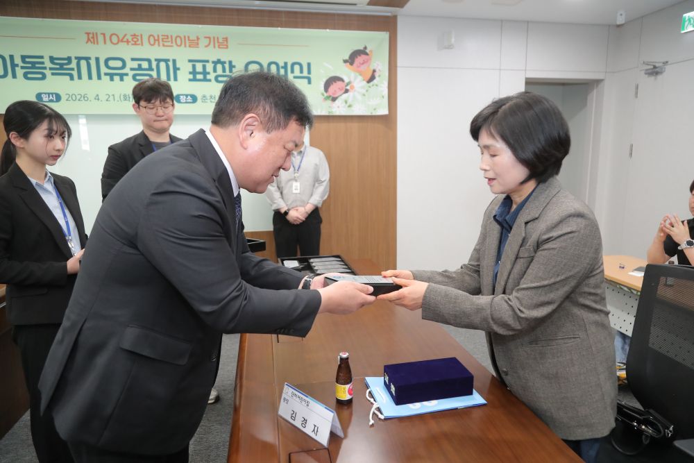 수여식은 21일 시청 중회의실에서 열렸다. 이번 표창 대상자는 총 12명으로 ▲보육시설 6명 ▲아동복지시설 3명 ▲유관기관 2명 ▲춘천시 1명이다. 이들은 아동 양육과 보호, 권리 증진 등 다양한 현장에서 아동복지 향상에 기여한 공로를 인정받았다.