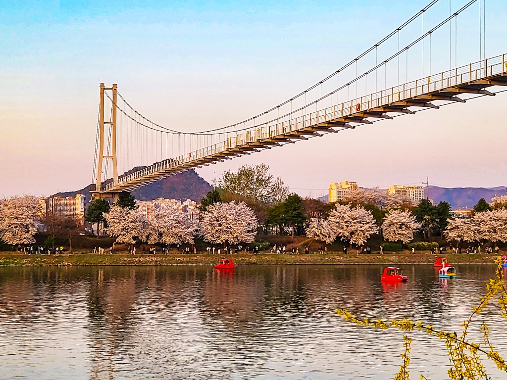 겨울의 정막을 깨고 찾아온 공지천의 봄은 온통 연분홍빛 벚꽃으로 물들며 활기찬 생동감을 뿜어낸다. 춘천의 대표적인 벚꽃 명소답게 공지천 산책로를 따라 끝없이 이어진 벚나무들이 일제히 꽃망울을 터뜨리면, 마치 하늘을 가린 분홍색 터널 아래를 걷는 듯한 환상적인 경험을 선사한다. 따스한 봄볕이 호수 면에 반사되어 윤슬로 반짝이고, 가벼운 봄바람에 흩날리는 꽃잎들이 눈처럼 내려앉는 공지천의 봄은 춘천에서 가장 아름답고 설레는 장면으로 기억된다.