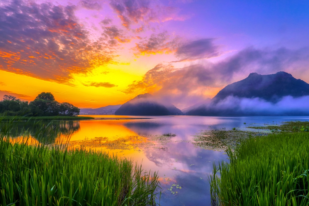 강원특별자치도 춘천시의 상징인 의암호는 해가 뜨고 질 때면 수면과 하늘이 온통 붉게 물드는 장엄한 광경을 연출한다. 삼악산과 드름산 등 호수를 둘러싼 웅장한 산등성이 사이로 해가 넘어가며 뿜어내는 빛이 잔잔한 호수 면에 반사되어 황금빛 물결을 이룬다. 의암호의 일몰은 기상 조건에 따라 보랏빛에서 선홍빛에 이르기까지 다채로운 색조의 변화를 보이며 시각적 감동을 선사한다.