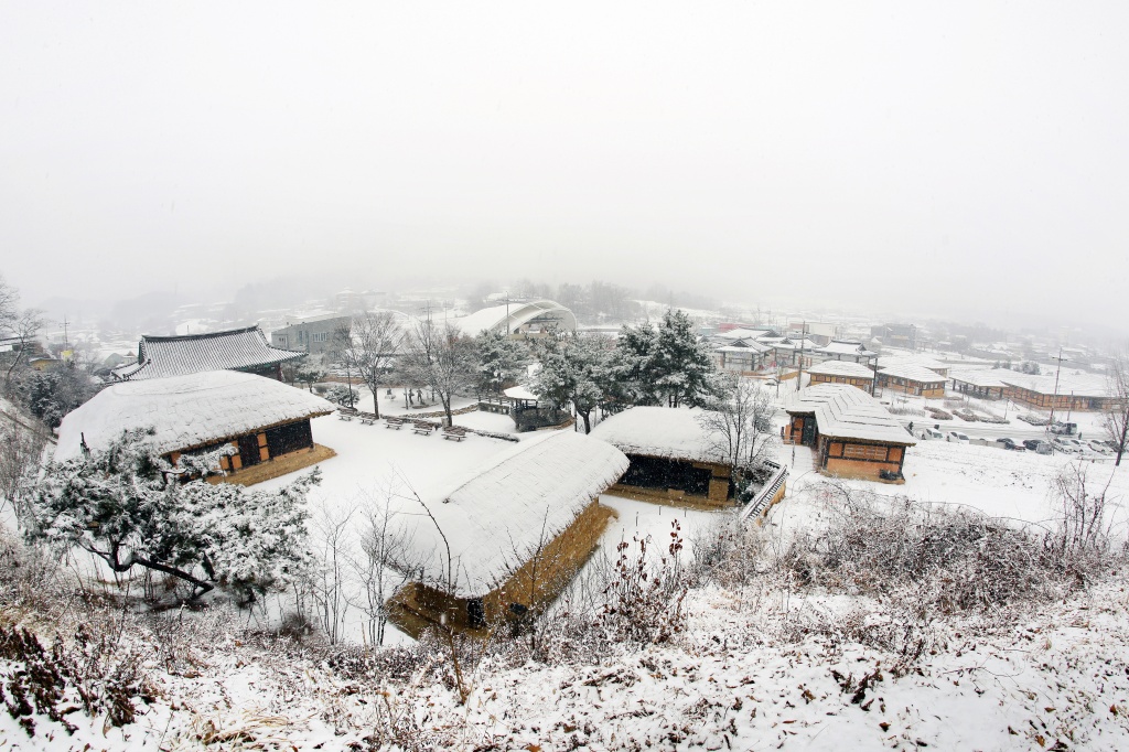 겨울철 김유정 문학촌은 작가 김유정의 소설 속에 등장하는 순박하고 서정적인 향토색에 하얀 눈이 더해져 한 폭의 수묵화 같은 절경을 선사한다. 나지막한 산세에 둘러싸인 실레마을 전체가 눈에 덮이면, 복원된 초가 형태의 생가와 정자들은 처마마다 고드름을 매달고 고즈넉한 분위기를 자아낸다. 화려한 장식 없이 소박하게 들어앉은 전통 건축물들은 겨울의 차분한 공기와 어우러져 관람객들로 하여금 작가가 고뇌하며 거닐었을 당시의 시대적 배경 속으로 깊이 몰입하게 만든다.
