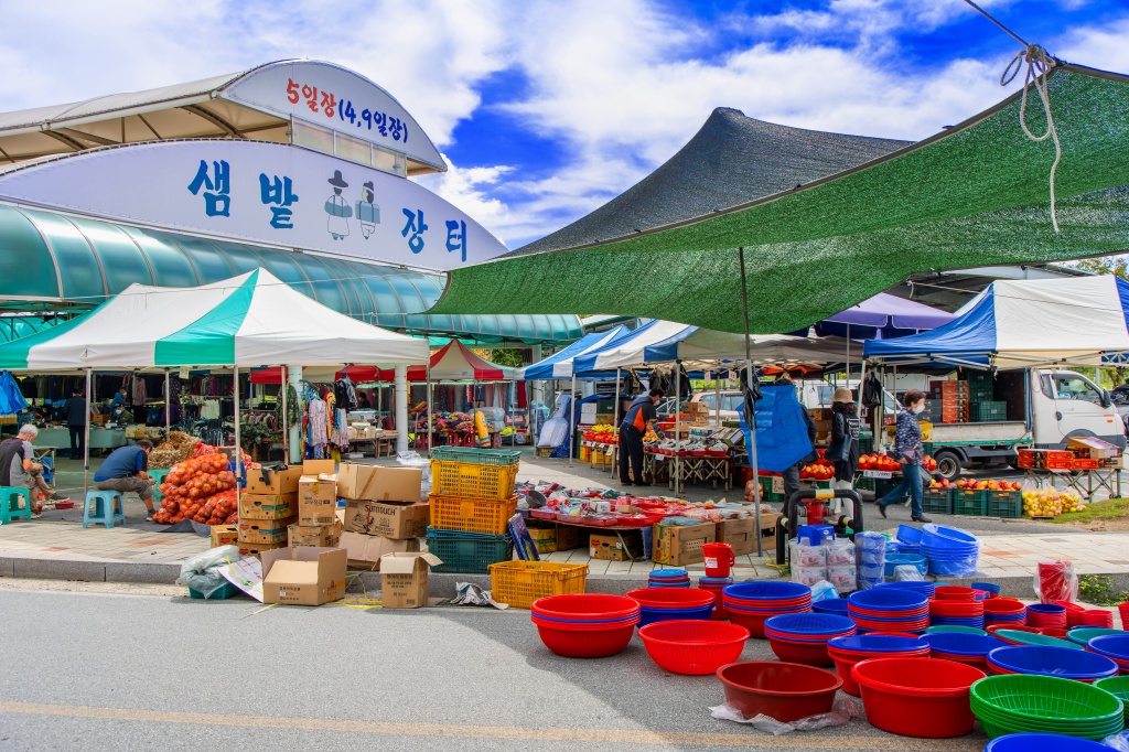 춘천시 신북읍 율문리에 위치한 샘밭장은 100년 이상의 역사를 자랑하는 유서 깊은 재래시장으로, 매달 4일과 9일에 장이 선다. 소양강댐으로 향하는 길목에 자리 잡은 이 시장은 대규모 상업화된 시장과는 달리 소박하고 정겨운 시골 장터의 모습을 고스란히 간직하고 있는 것이 특징이다. 인근 농가에서 직접 재배한 신선한 채소와 과일이 저렴하게 거래되며, 장날마다 열리는 간이 음식점에서는 춘천의 넉넉한 인심을 느낄 수 있는 감자전과 두부 등의 전통 먹거리를 만날 수 있다.