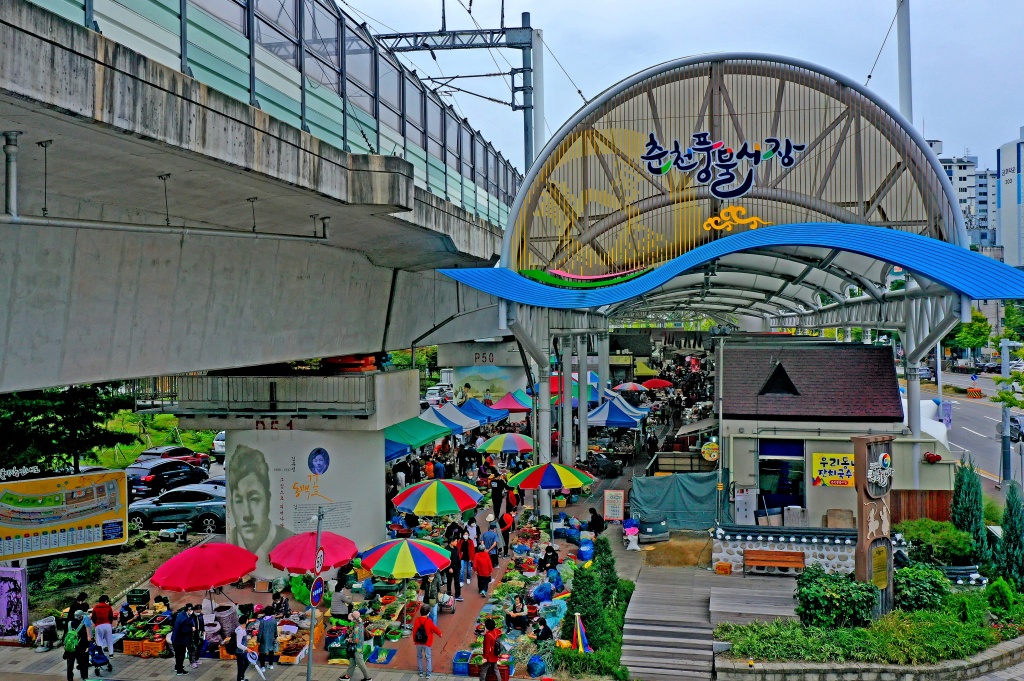 강원특별자치도 춘천시 온의동 전철 교각 아래 위치한 춘천 풍물시장은 남춘천역 인근의 지리적 이점을 살린 춘천의 대표적인 풍물 전통시장이다. 과거 약사천 주변의 노점상들을 정비하여 현재의 현대화된 장터로 이전 조성되었으며, 2일과 7일에 열리는 오일장 날에는 강원특별자치도 전역에서 모여든 상인들과 시민들로 인산인해를 이룬다. 이곳은 제철 농산물과 산나물은 물론, 메밀전병과 막국수 등 춘천의 향토 먹거리가 풍부하여 전철을 이용해 방문하는 외지 관광객들에게도 필수 여행 코스로 각광받고 있다.