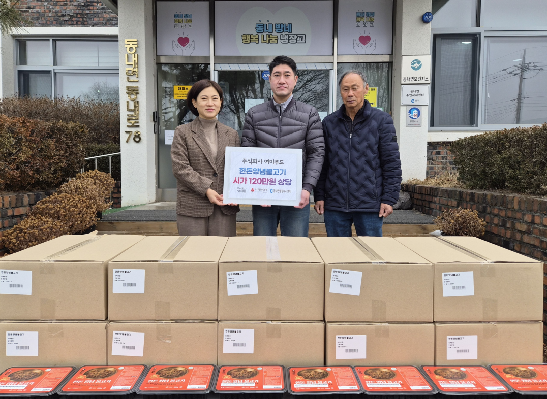 ㈜여미푸드(대표 오용승)는 2월 11일, 동내면 행정복지센터(면장 최명애)를 방문해 120만원 상당의 한돈양념불고기를 기부했다.