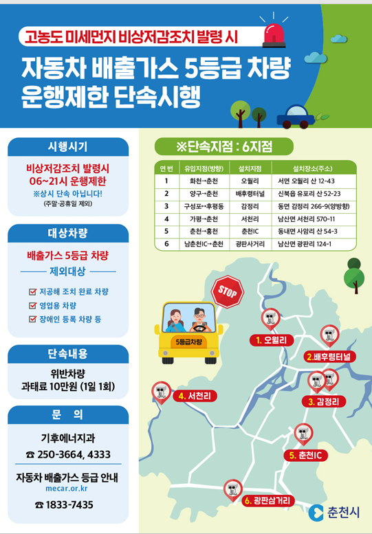 □ 고농도 미세먼지 비상저감조치 5등급차량 운행제한 단속 가. 단속지역 : 춘천시 관내 단속지점 ※6개소 ※ 오월리, 배후령터널, 감정리(양방향), 서천리, 춘천IC, 광판사거리 나. 단속대상 : 전국 5등급차량 중 저공해 미조치 차량 다. 단속시기 : 미세먼지 비상저감조치 발령시 06:00 ~ 21:00 (주말, 공휴일 제외) 라. 단속방법 : 운행제한 단속카메라 및 배출가스 운행제한 시스템 활용 마. 과 태 료 : 10만원(1일 1회) 바. 제외대상 : 저공해조치 완료, 영업용, 장애인 등록 차량 등 사. 기타문의 : 기후에너지과 ☏250-3664 |