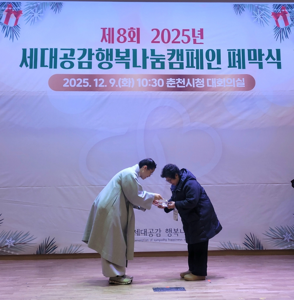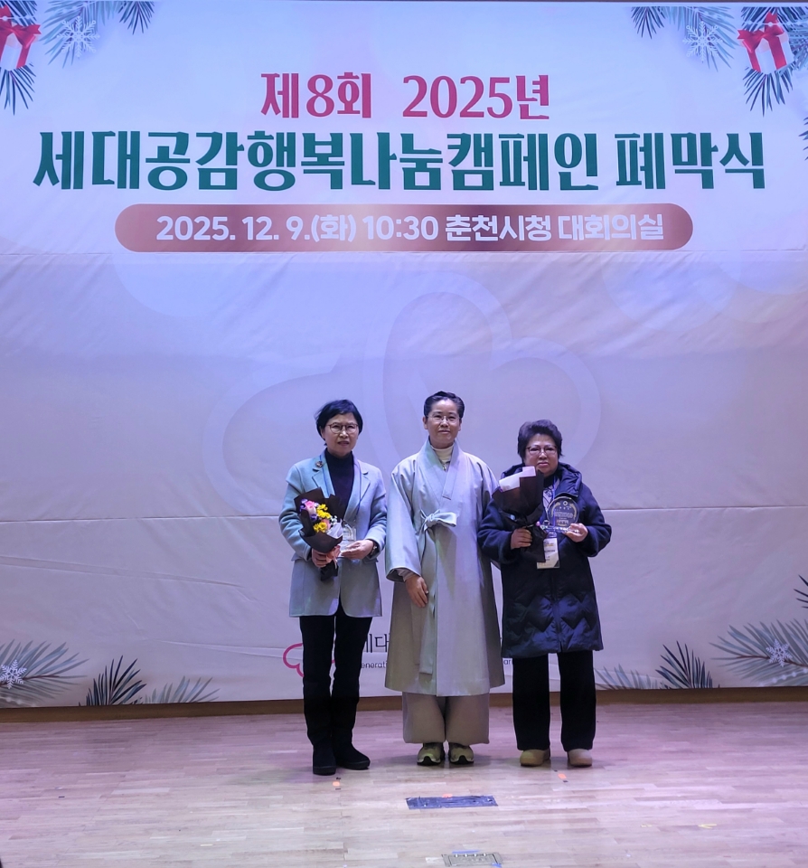 효자3동 지역사회보장협의체 송은자부위원장님은 나눔문화에 기여한 공로로 2025.12.9.(화) 세대공감 행복나눔 캠페인 폐막식에서 춘천동부노인복지관상을 수상했습니다.
