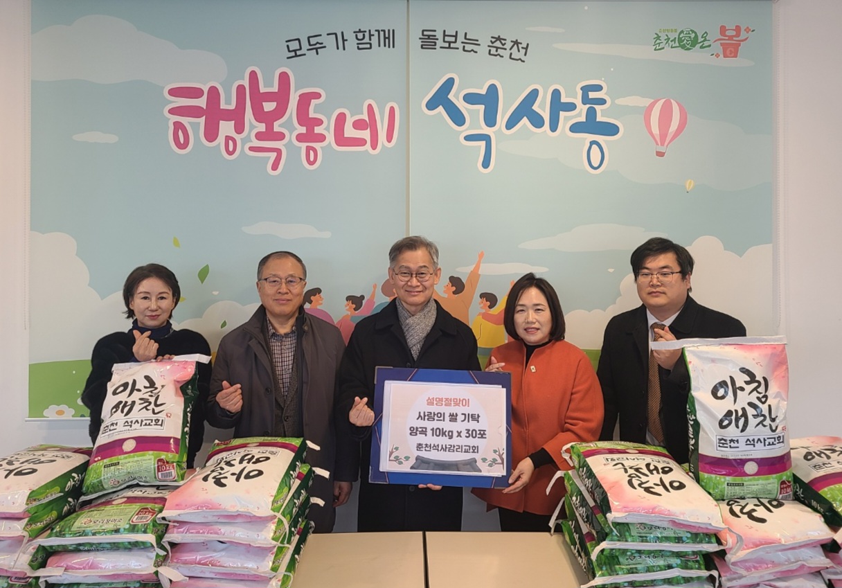 춘천석사감리교회(담임목사 손학균)는 2월 4일 설 명절을 맞이하여 석사동 어려운 이웃에게 전달해 달라며 양곡 10kg짜리 30포(100만원 상당)를 석사동행정복지센터에 기탁했다.
