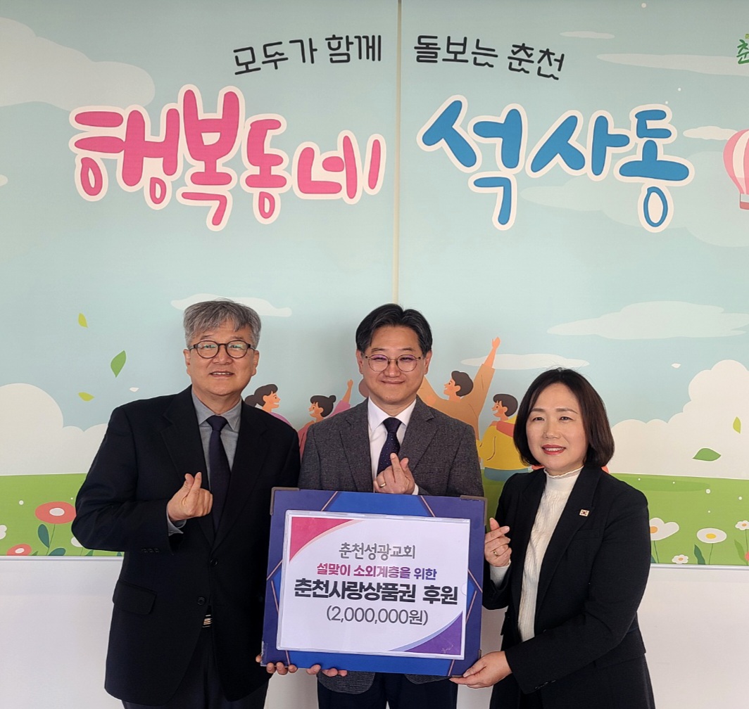 춘천성광교회(목사 조용아)는 2월 9일 석사동행정복지센터(동장 조영주)를 방문해 설 명절을 맞이하여 춘천사랑상품권 200만원(1만원권 200매)를 기부했다.