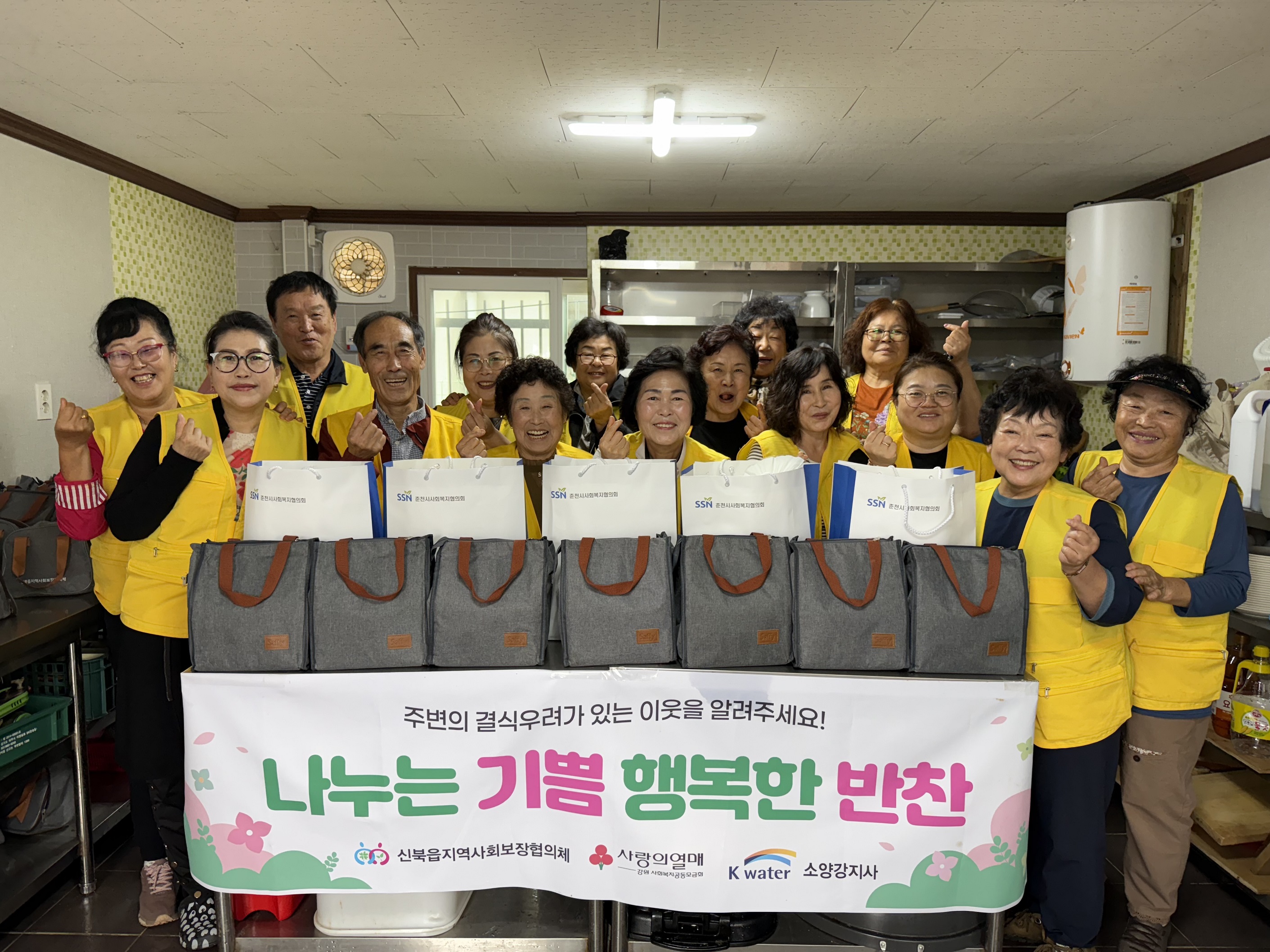 신북읍 지역사회보장협의체(위원장 김신림)는 16일 강원사회복지공동모금회와 K-water 소양강댐지사의 후원을 받아 신북읍 행정복지센터(읍장 김신)에서 직접 만든 반찬을 독거노인 및 저소득가정 등 41가구에 전달했다.