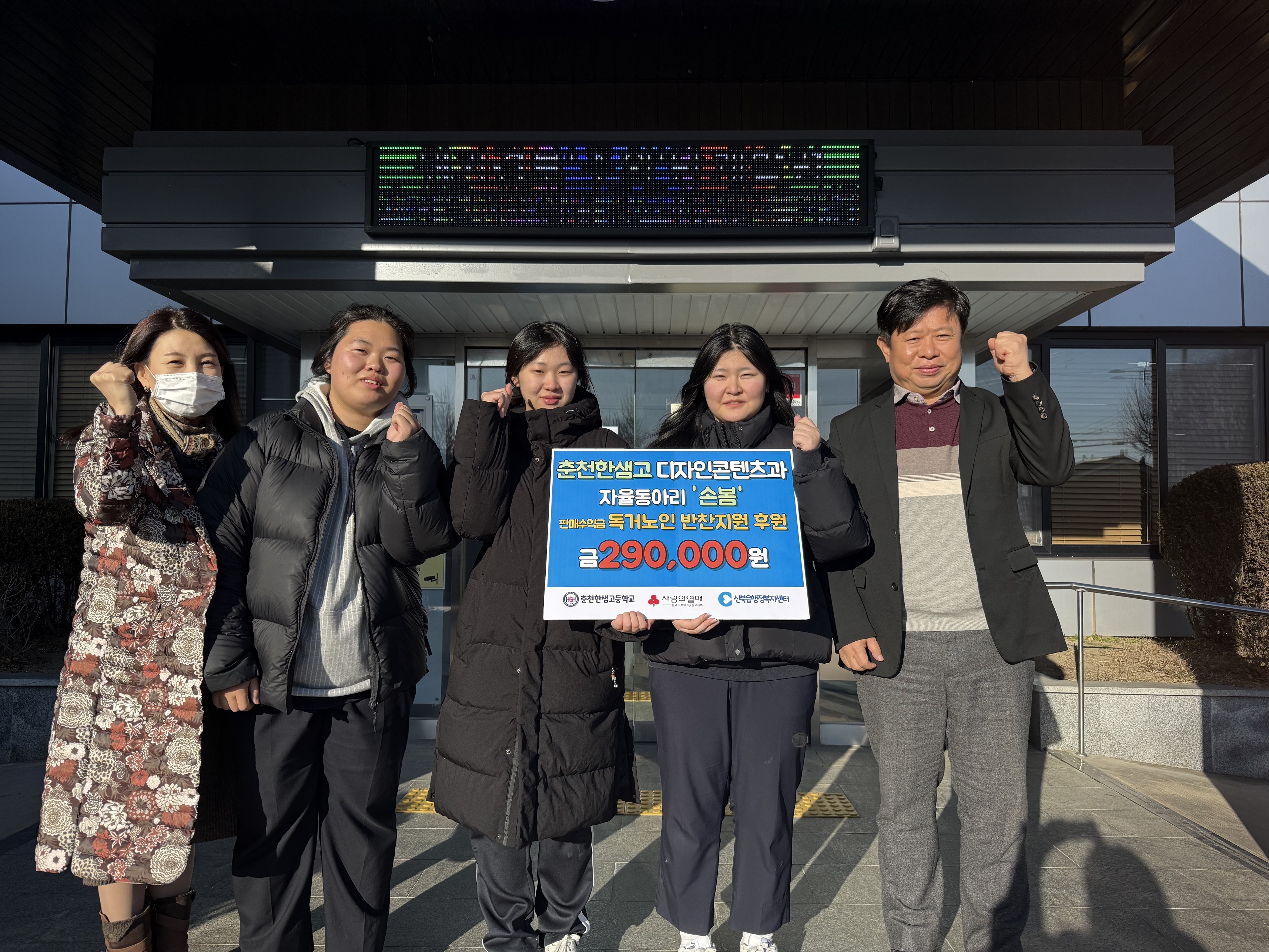 춘천한샘고(교장 김학배) 디자인콘텐츠과 자율동아리 ‘손봄’(지도교사 김은경)은 3일 신북읍행정복지센터(읍장 김신)를 방문하여 관내 독거노인 반찬지원을 위해 써달라며 동아리 활동 판매수익금 290천원을 전달했다.