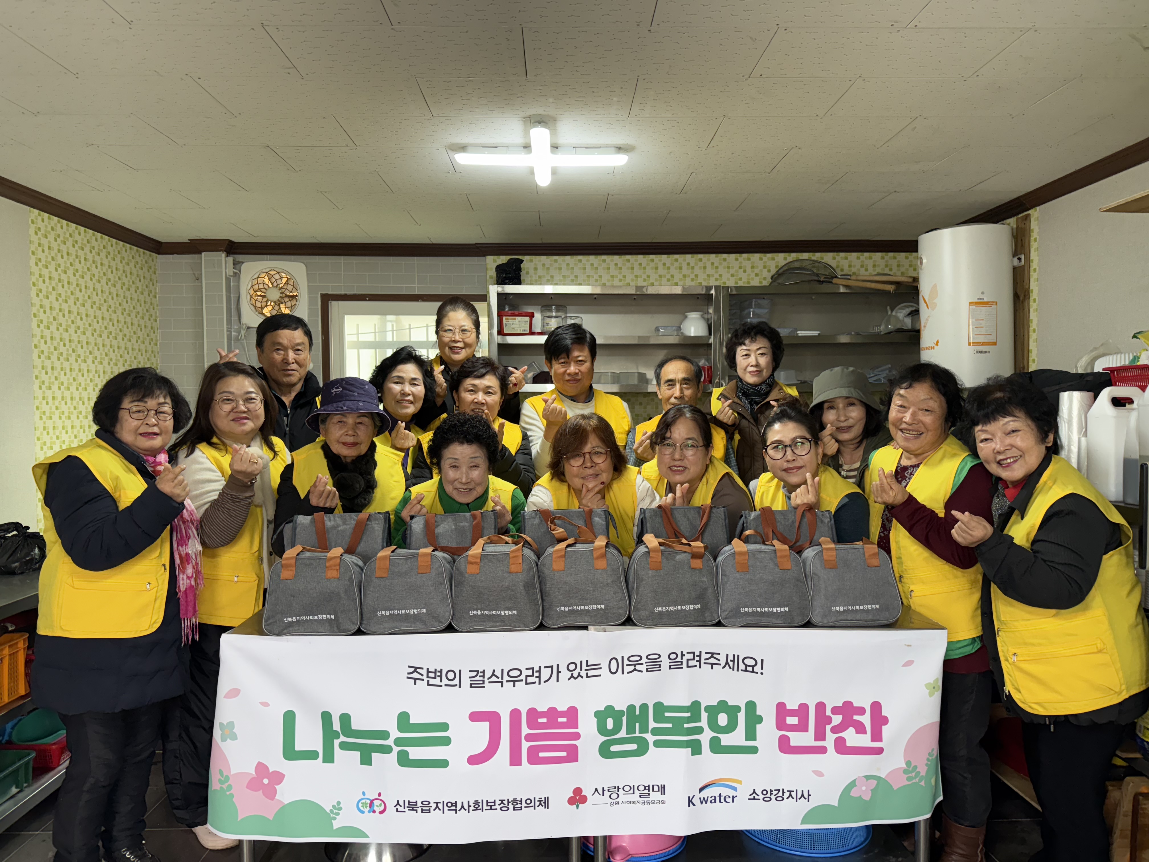 신북읍 지역사회보장협의체(위원장 김신림)는 11일 강원사회복지공동모금회와 K-water 소양강댐지사의 후원을 받아 신북읍 행정복지센터(읍장 김신)에서 직접 만든 반찬과 ㈜우주푸드빌(대표 이용진)에서 후원한 떡갈비 10Kg(10만원 상당)을 독거노인 및 저소득가정 등 41가구에 전달했다.