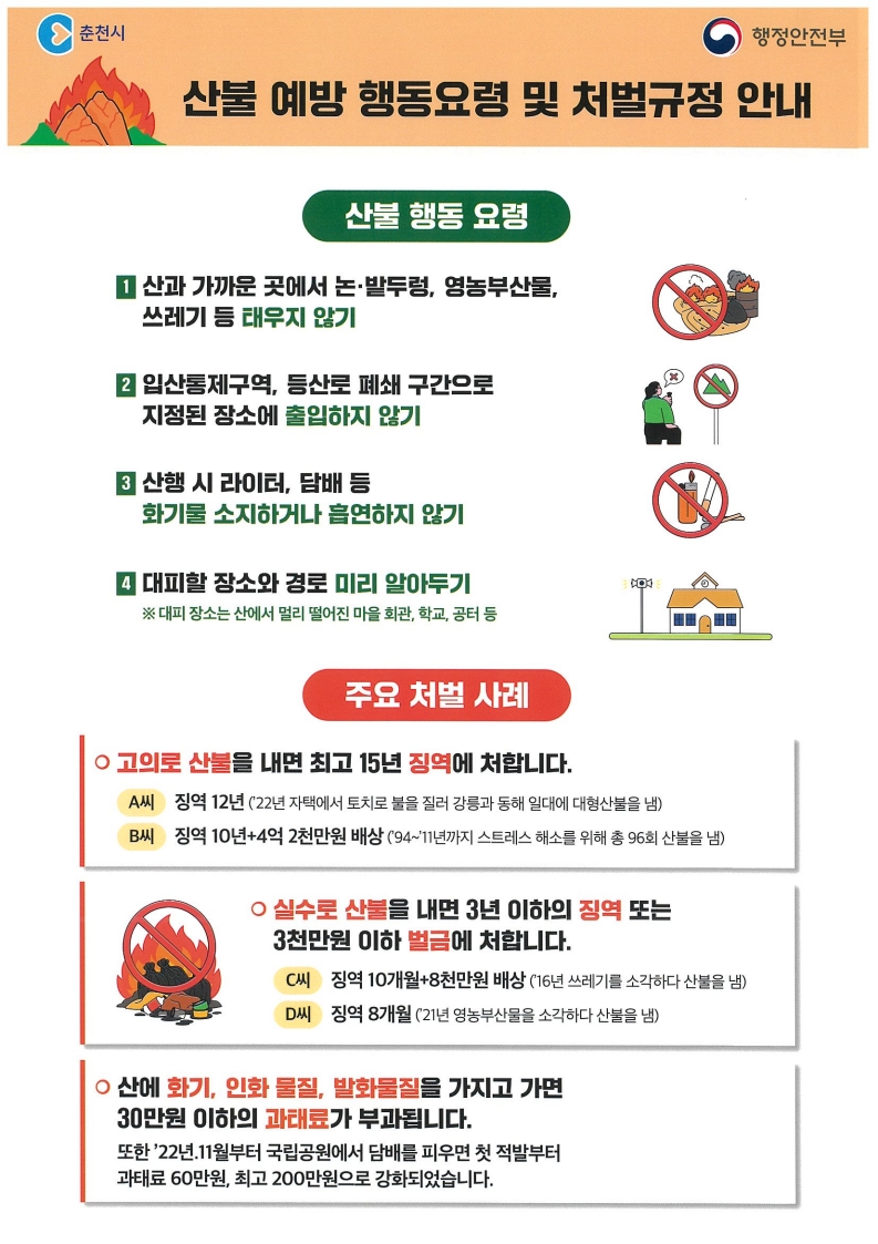 이에 다음과 같이 산불 방지 행동요령을 알려드리니 주민, 농가 여러분께서는 이를 반드시 준수하여 산불방지에 힘써주시기 바랍니다.