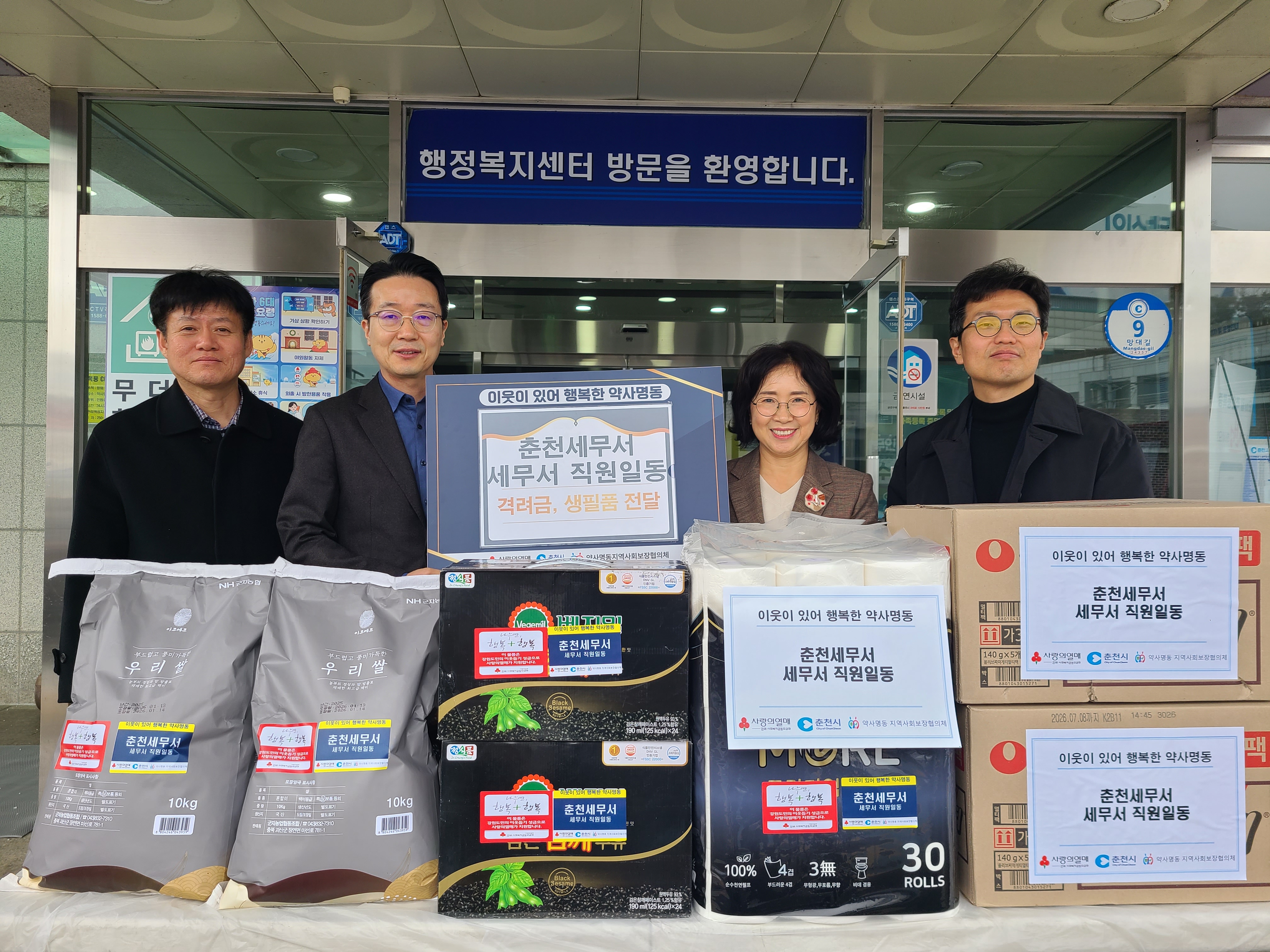 춘천세무서(서장 강찬호) 직원들은 2월 4일 설 명절을 맞아 관내 취약계층을 돕기 위해 성금을 모아 격려금과 생필품을 약사명동행정복지센터에 전달했다.
