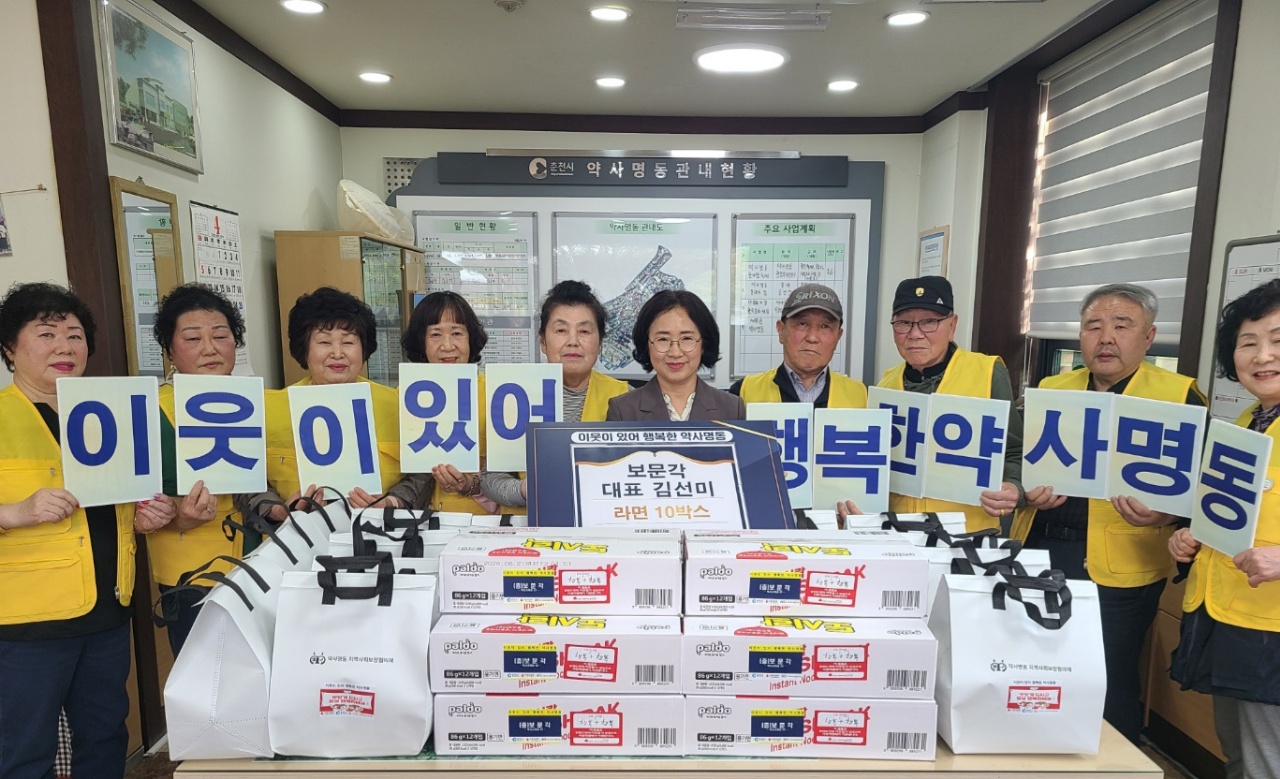 중화요리 식당 보문각(대표 김선미)에서 후원받은 컵라면(10박스)을 관내 취약계층 35가구에 전달하였다.