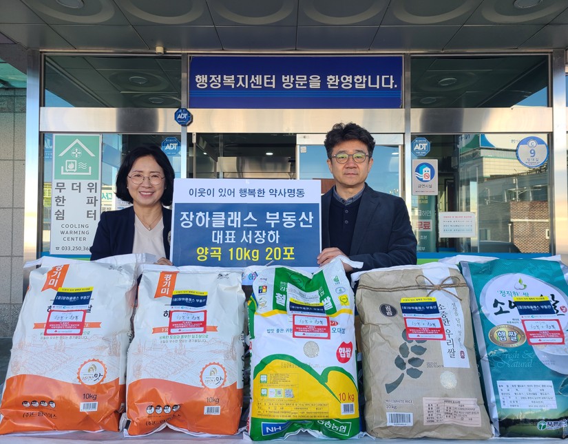 장하클래스 부동산(대표 서장하)은 11월 10일 관내 취약계층을 위해 양곡 10kg 20포를 약사명동행정복지센터에 전달했다.