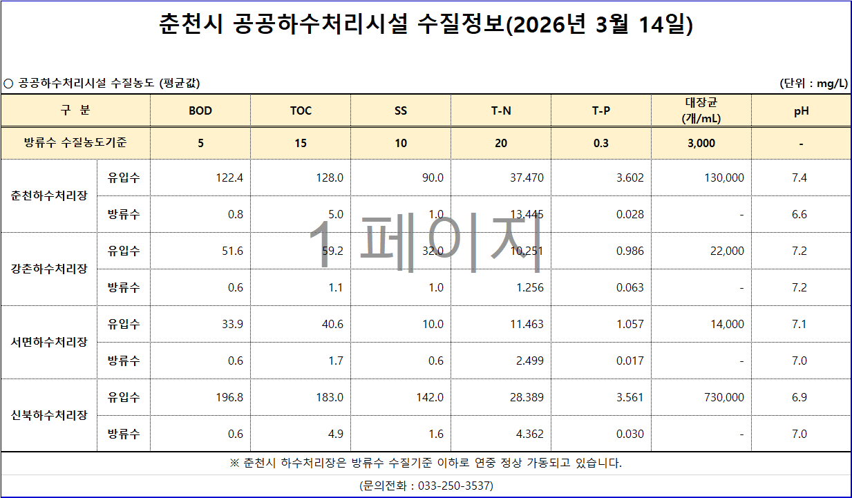 2026년 3월 14일 춘천시 하수처리시설 수질정보