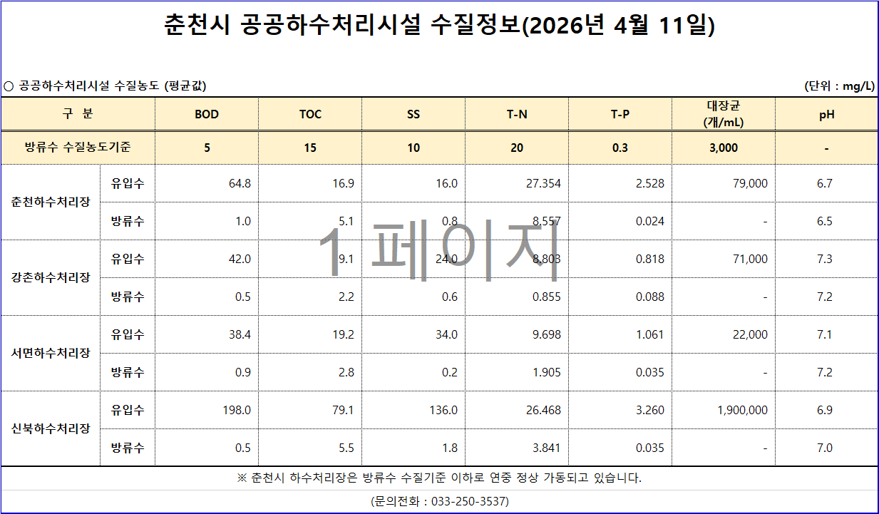2026년 4월 11일 춘천시 하수처리시설 수질정보