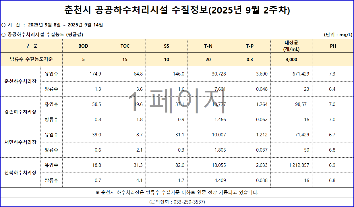 2025년 9월 1주차 춘천시 하수처리시설 수질정보