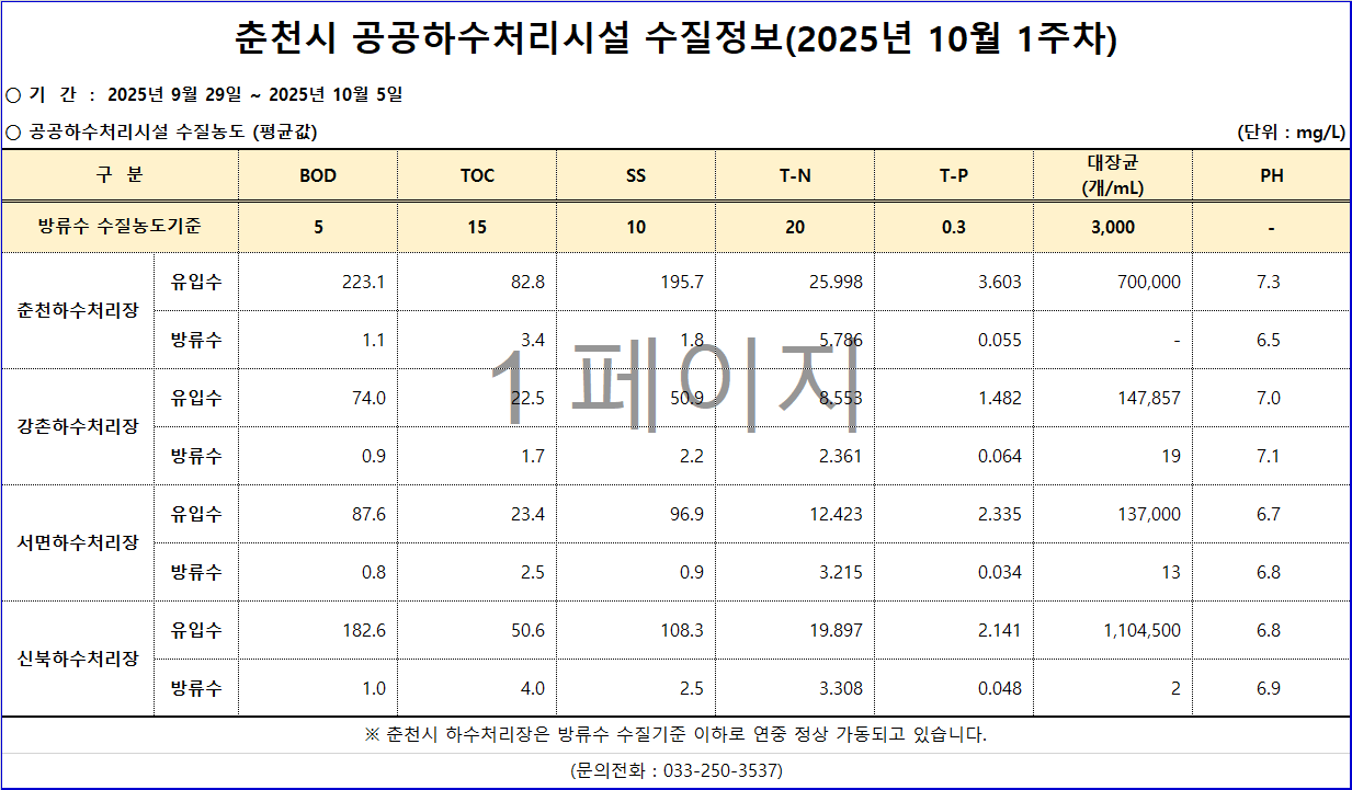 2025년 10월 1주차 춘천시 하수처리시설 수질정보