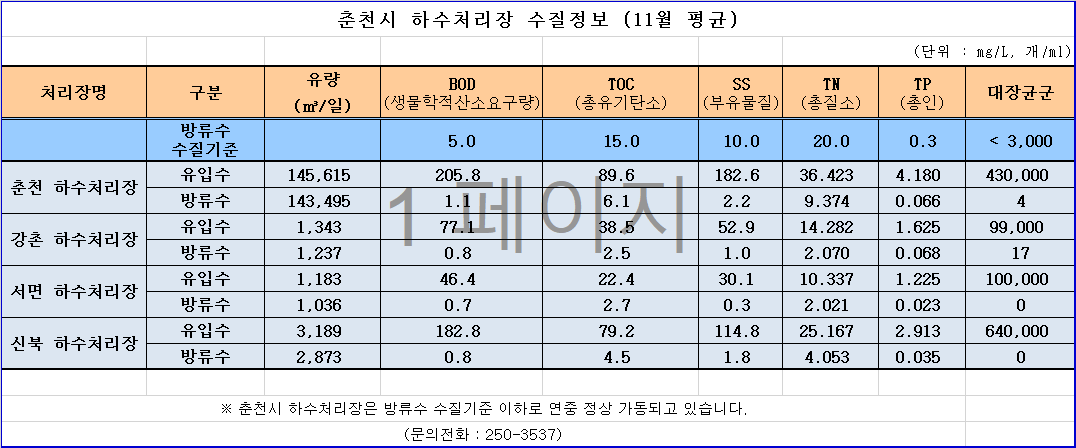 2025년 11월 4주차 춘천시 하수처리시설 수질정보