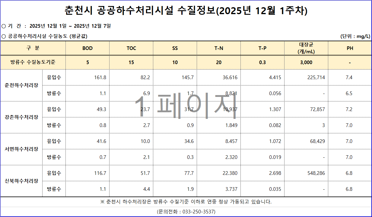 2025년 12월 1주차 춘천시 하수처리시설 수질정보